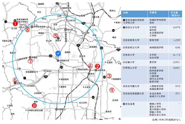 テック系人材を輩出する奈良女子大、奈良先端大、奈良高専と市は、産業分野に特化した連携協定を締結。当該地は、テック系3校をはじめ多くの教育機関へアクセスしやすい立地。