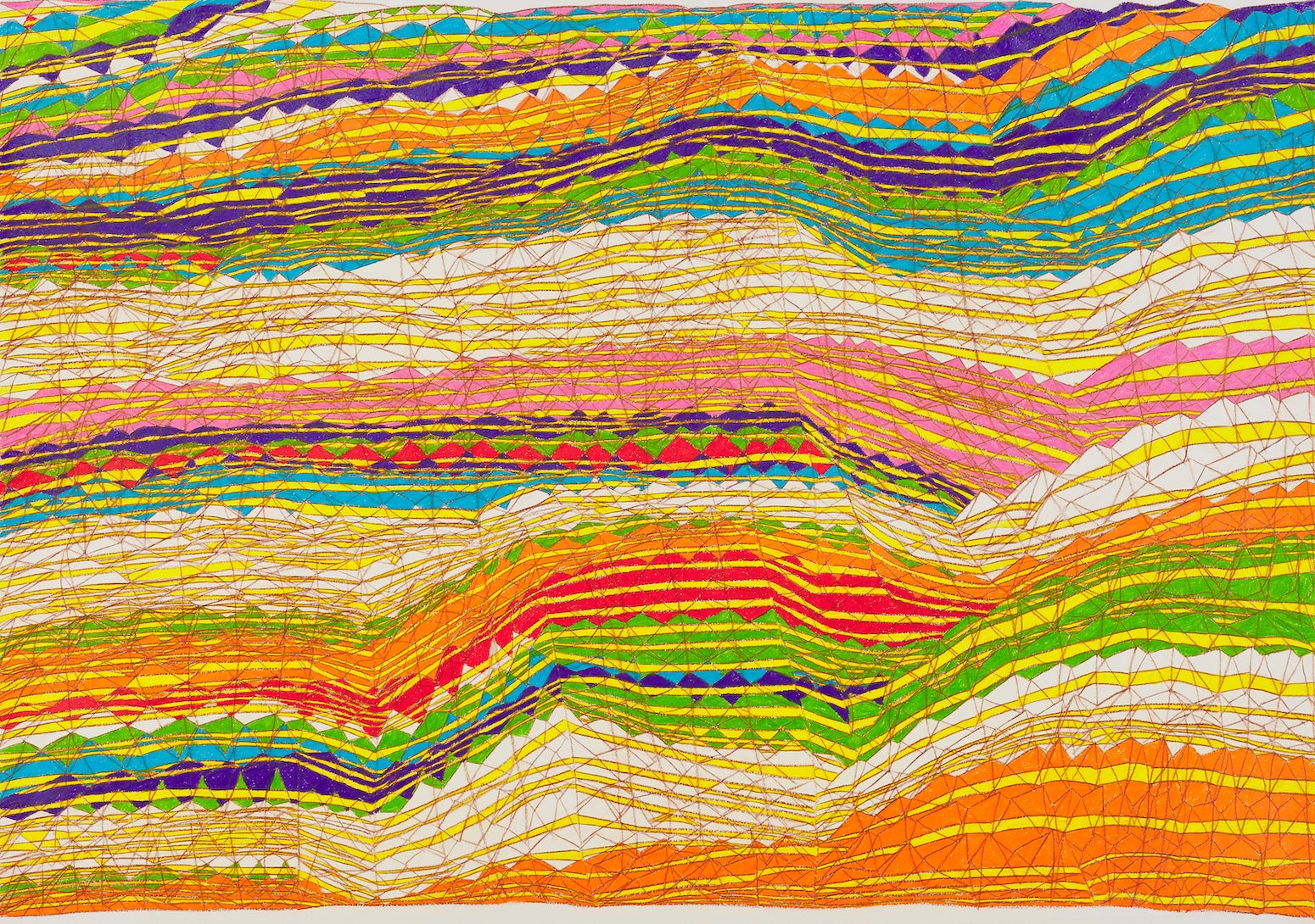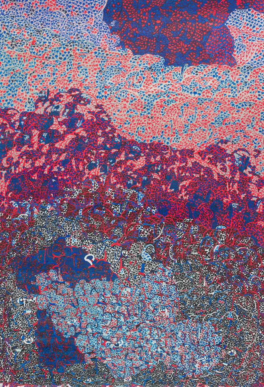 同心円を描いたどんなに力強い作品でも、それが紙の上のことであるならば、太陽の放射エネルギーにはとうてい匹敵しませんが、この作品は同じような活力を持っているかもしれません。紫がかった色彩を放つこの作品は、まるで急速に芽生えた花のように、細かな点の配列が広がっています。植物の成長において根源的な原動力である太陽の力と、その最も華麗な結果である美の開花が組み合わされています。浅野春香さんによって横長の米袋の上に描かれたこの幾何学的な萌芽の広がりが、審査員の心をすぐに捉えたのも不思議ではありません。