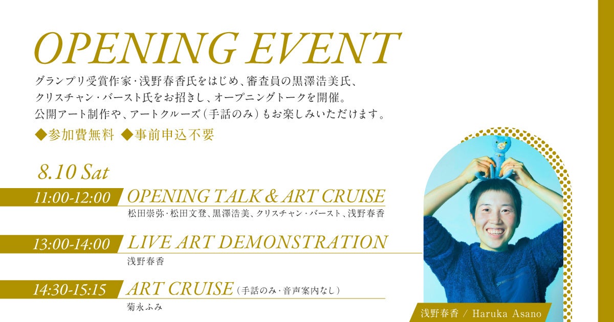 展覧会初日を記念し、オープニングイベントを開催します。グランプリ受賞作家・浅野春香、審査員の黒澤浩美、クリスチャン・バースト、主催のヘラルボニーCo-CEO 松田崇弥・松田文登が登壇。さらに、浅野春香氏による公開アート制作や、手話のみで行われるアートクルーズなど、多数イベントをご用意しております。展覧会の幕開けを飾る特別な日に、皆様のご来場を心よりお待ちしています。