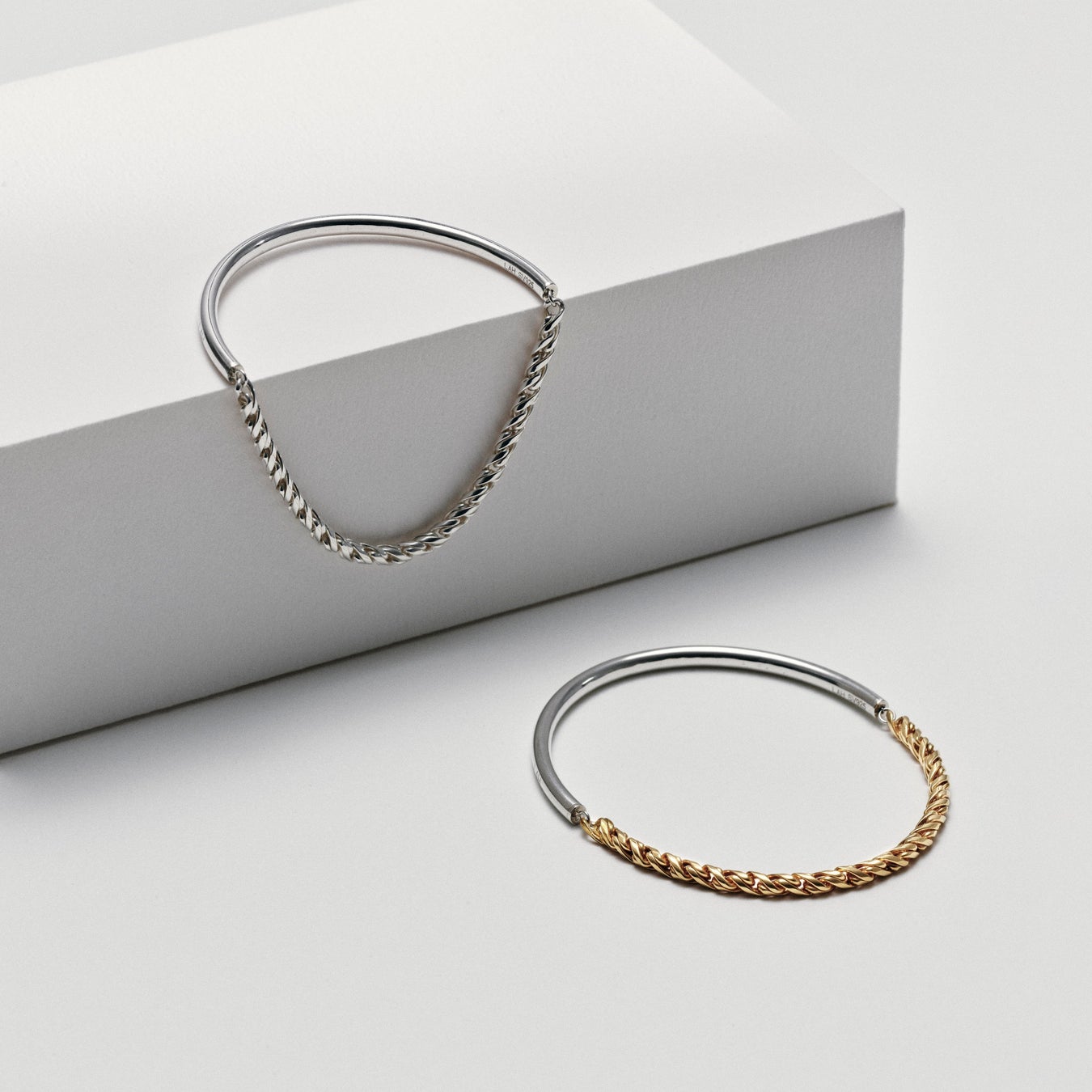 ブレスレットはヌードシルバーのみのベーシックなタイプと、チェーン部分にイエローゴールドメッキを施したコンビカラーの2 色展開。