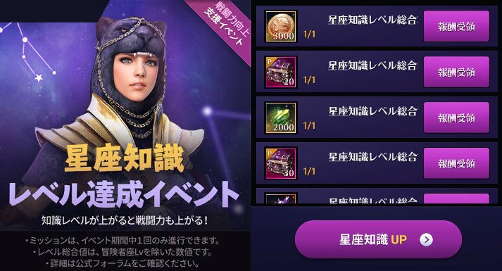 星座知識レベルを一定値まで上昇させると報酬が受け取れるミッションとなっており、冒険の証やハドゥム闇の精霊ルーン箱、次元の欠片、次元の水晶等、様々なアイテムが獲得できます。