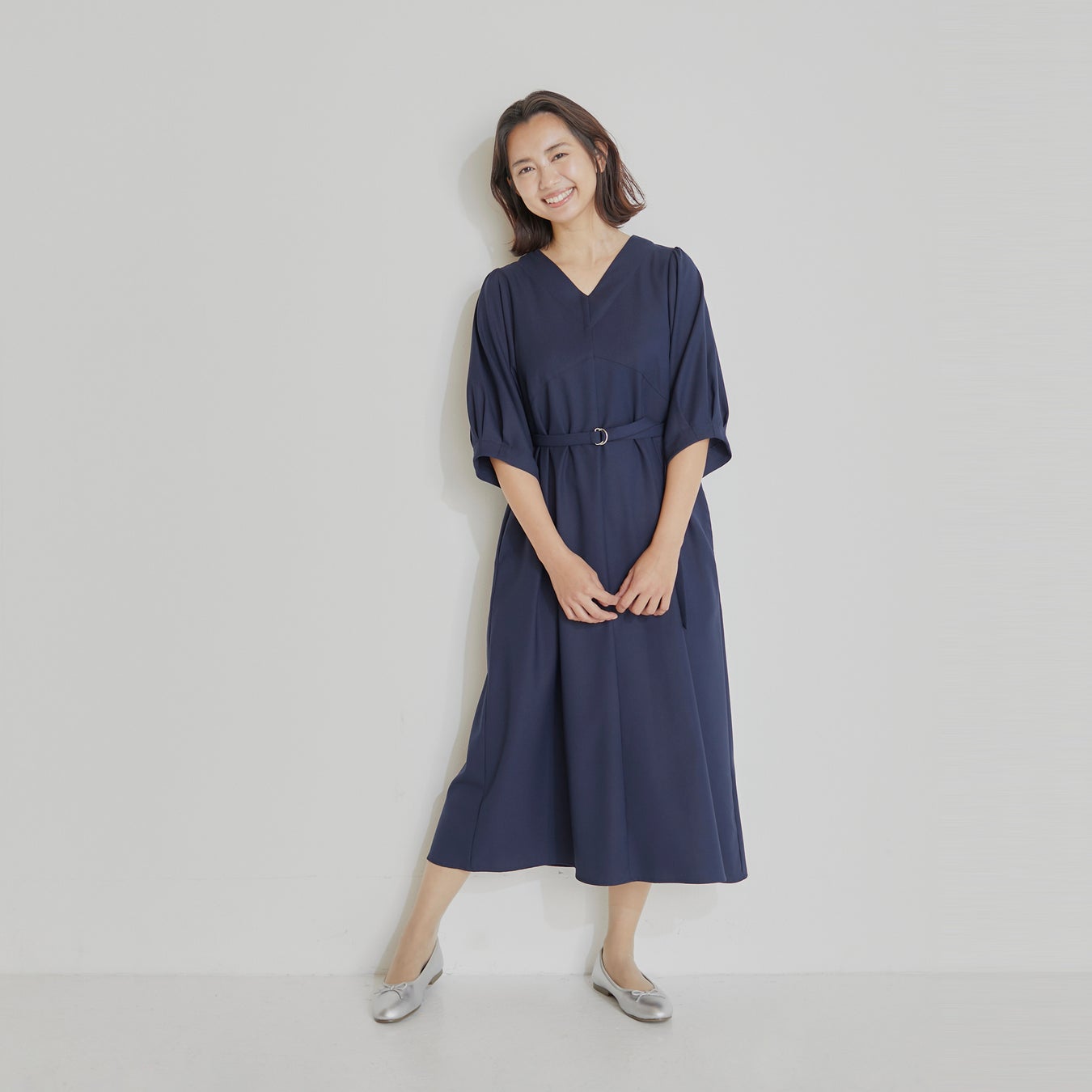 程よいフレアラインがエレガントなワンピース。防汚撥水加工を施した素材を使用し、シワになりにくく、リネンのような風合いをイージーに楽しめます。Vネックとボリュームスリーブデザインが、体型をカバーしながらもすっきりと見せてくれます。共布ベルト付きで2WAYの着こなしができます。