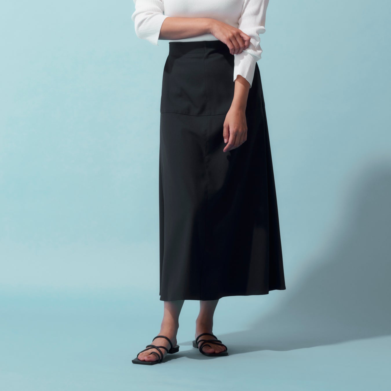 ほんのりフレアシルエットのスカート。防汚撥水加工を施した素材を使用し、シワになりにくく、リネンのような風合いをイージーに楽しめます。高めの位置で切り替えることで、美しいシルエットとスタイルアップ見えをかなえます。同素材のブラウスとのセットアップもおすすめです。