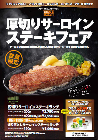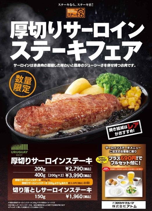 コロワイドグループの株式会社アトム(本社:神奈川県横浜市、代表取締役社長:山角豪)は、「ステーキ宮」123店舗で、2023年1月13日(金)から「ウルグアイ産厚切りサーロインステーキ」を販売いたします。