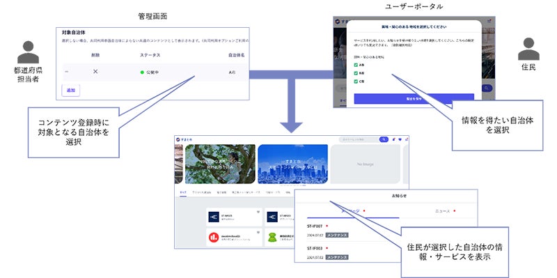 また、「CIVILIOS」を運用する管理者はコンテンツ毎に配信先の自治体を設定できるため、都道府県全域向け・特定自治体向けなど、利用対象者に応じたサービス・情報提供を行うことができます。