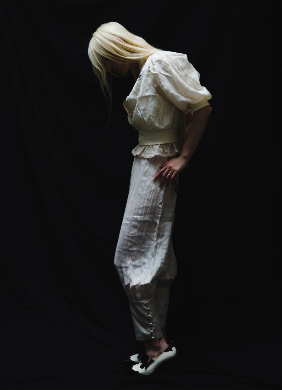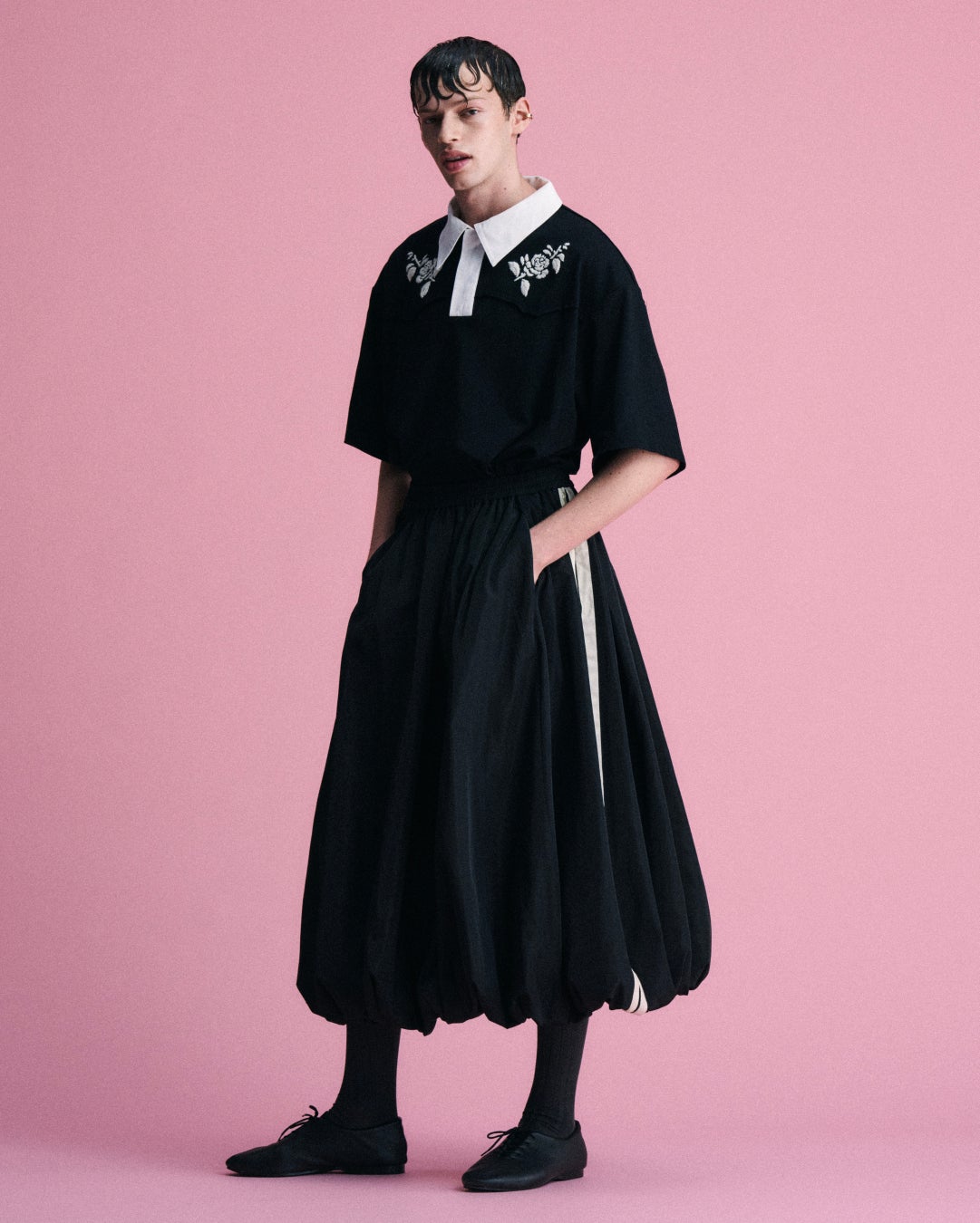 ロマンティックとは、⽢美な装飾や感傷にとどまるものではない。 服の構造や⼿仕事の痕跡が、⼈の存在と結びついたときに⽴ち現れる静かな強さを指す。 ⾊を削ぎ落とした静寂の中で、 クチュールライクな構築や刺繍のひと針、 ラッフルの揺らぎといったブランド独⾃のディテールがより鮮明に浮かび上がる。 インスピレーションは、1920〜60年代のクチュールやヴィンテージの記憶。 アンティークホワイトの室内着に宿る静謐さと親密さ、 そして70年代のレトロスポーツが纏うノスタルジックな軽やかさ。 異なる時代の気配を重ね合わせ、服は新しいフォルムとバランスを獲得する。 過去と未来、クラシックとモダン、静謐と躍動。 それらが交差する中に、曖昧な余⽩を抱きながら── 「新しいロマンティックの形」を提⽰する。