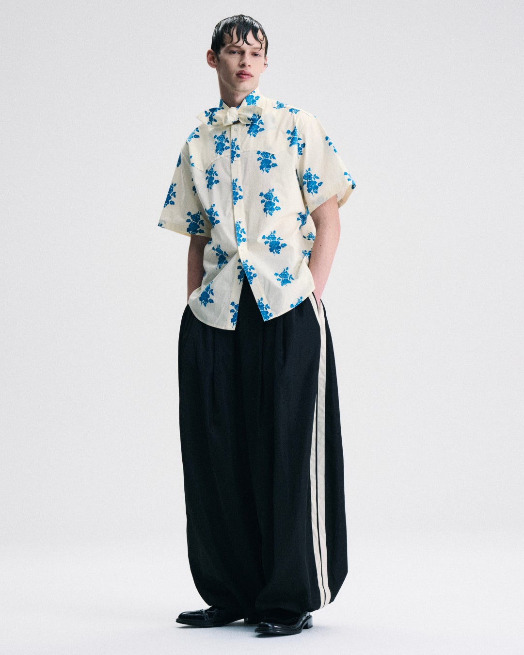 ルネサンス絵画で⽤いられた光と影をぼかす技法であるʼʼSfumatoʼʼ マスキュリンとフェミニン、タフさと繊細さの境界をあえて曖昧にしながら、 新しいバランスを追求したコレクション。 ウェスタンディテールは今季の構造的な軸となっており、 シャープなヨークやテーラードといったマスキュリンな要素に、 レースやチュールといったシアーでフェミニンな素材感を掛け合わせ、 男性らしさの中に揺らぎを差し込んだ。 ブランドを象徴するモチーフである薔薇。 コレクション全体がダークトーンで構成される中、 視線を奪う鮮やかなブルーで表現。 さらに⼀部のアイテムには⼿刺繍で同じモチーフを施しており、 マスキュリンな造形の中にフェミニンな情緒を滲ませている。 ラガーシャツやスポーティーなディテールは、 どこか懐かしさを帯びたレトロな表情で登場しており、 ユニフォームのようなプリントTシャツ、サイドラインによって、 古き良きアスレチックムードを呼び起こす。 重ねられた素材やディテールが⽣む揺らぎ、そこに宿る⼿仕事の温もりは、 ただの装飾ではなく、装いに個を映し、新たなメンズウェアの形を提案している。