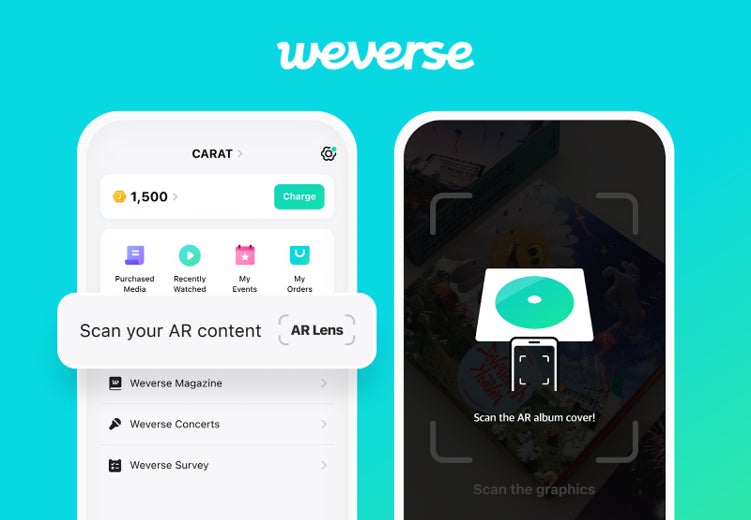AR Lensの使い方は簡単です。Weverseアプリの「プロフィールアイコン」で開いたメニューの中から「ARコンテンツをスキャン」を選択してカメラを起動し、アルバムジャケットを撮影すると画像が映像に変わったり、その再生された映像を保存したりすることが可能になります。