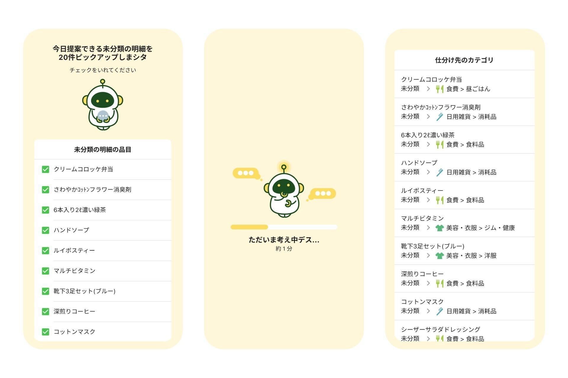 レシートの読み取りやクレジットカード連携において、支出項目のカテゴリを判別できず、手動で分類する必要のあった支出について、AIが商品名から分析し「食費」「日用品」「交通費」といった適切な項目を提案します※。これにより、ユーザーの記録作業を大幅に効率化するとともに、支出項目の「未分類」の削減につながり、より正確な支出傾向の把握や予算立案といった家計改善をサポートします。