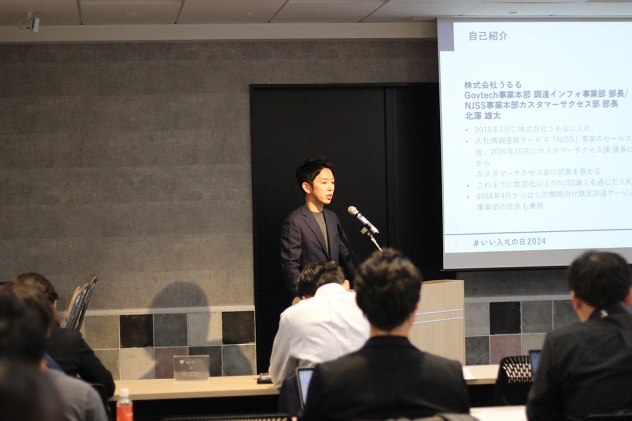 「公共入札市場の最新動向とスタートアップにおける入札参加の現状」をテーマに、うるるのNJSS事業本部カスタマーサクセス部およびGovtech事業本部および調達インフォ事業部 部長の北澤 雄太が、「NJSS」が収集した案件データをベースに分析した公共入札市場の動向やトレンド、またスタートアップの入札参加状況を詳しく解説しました。