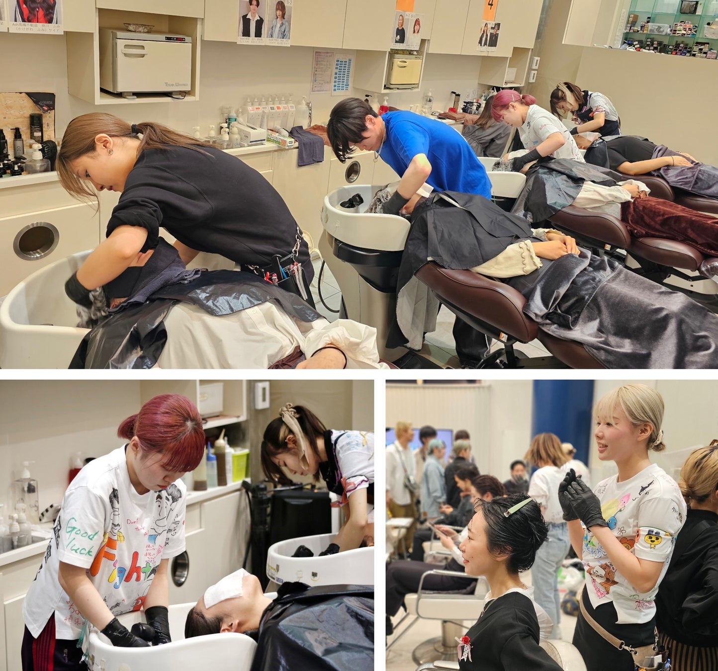 コンテストに向けて、参加者は日頃のサロンワークに加え、先輩スタッフから直接シャンプー技術の指導を受けながら準備を進めます。さらに、決勝戦当日には店舗スタッフが応援に駆けつけるなど、技術の習得を通じて、先輩・後輩のつながりが深まり、チームの結束力やモチベーション向上にもつながっています。