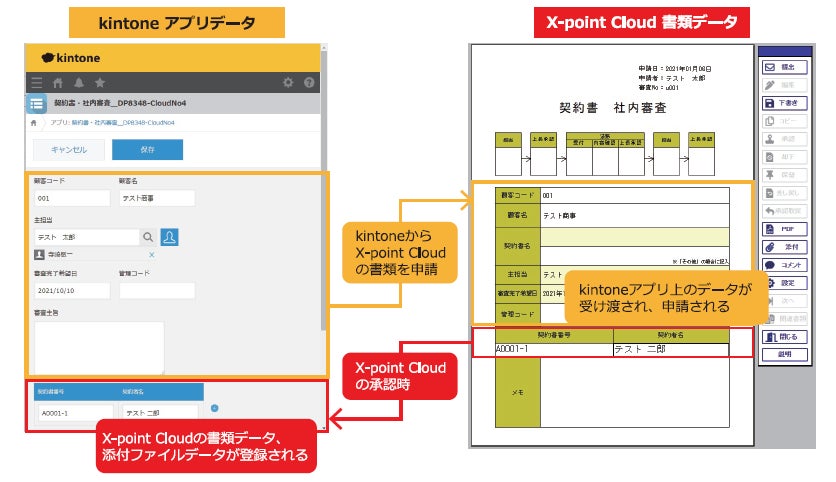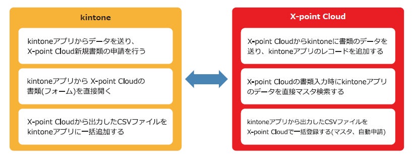 JavaScriptを書くことなく連携でき、kintoneアプリからX-point Cloudで書類の作成・申請・承認ができるほか、X-point Cloudで登録された書類データとkintoneアプリで登録されたデータを相互に受け渡しすることも可能となります。kintoneアプリで出力したCSVファイルからX-point Cloudでマスタの登録や書類の自動申請を行うといった業務の効率化も実現します。