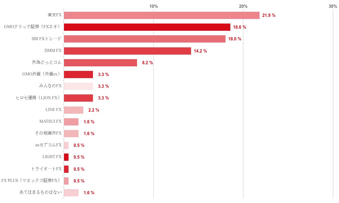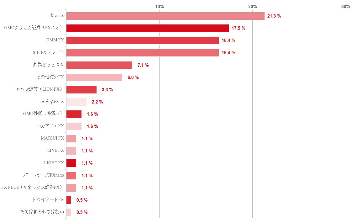 楽天FXが21.3%で最も多く、GMOクリック証券(FXネオ)が17.5%でこれに続いた。