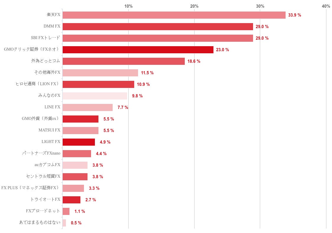 楽天FXが33.9%で最も多く、DMM FXとSBI FXトレードが29.0%でこれに続いた。
