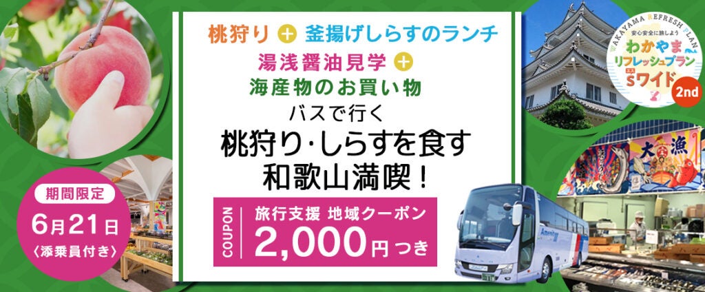 和歌山県の全国旅行支援「わかやまリフレッシュプランSワイド」を適用可能。旅行代金20%割引!+和歌山県地域クーポン付2,000円付き