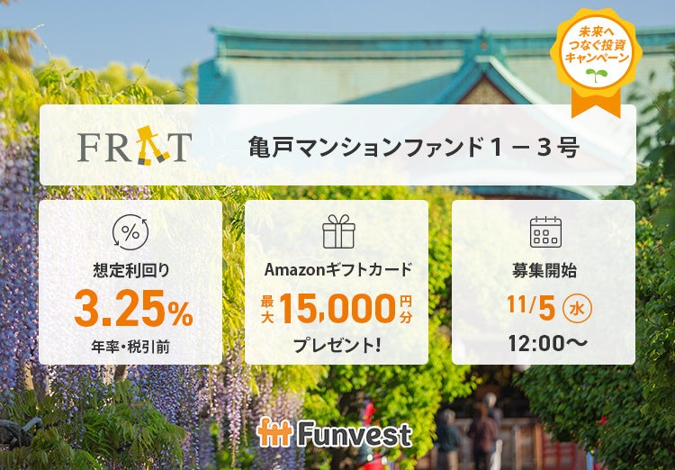 「未来をわかちあう投資」を提供する「Funvest(ファンベスト)」(以下、Funvest)は、「FRAT 亀戸マンションファンド1-3号」(以下、本ファンド)の募集を11/5より開始しますので、お知らせいたします。