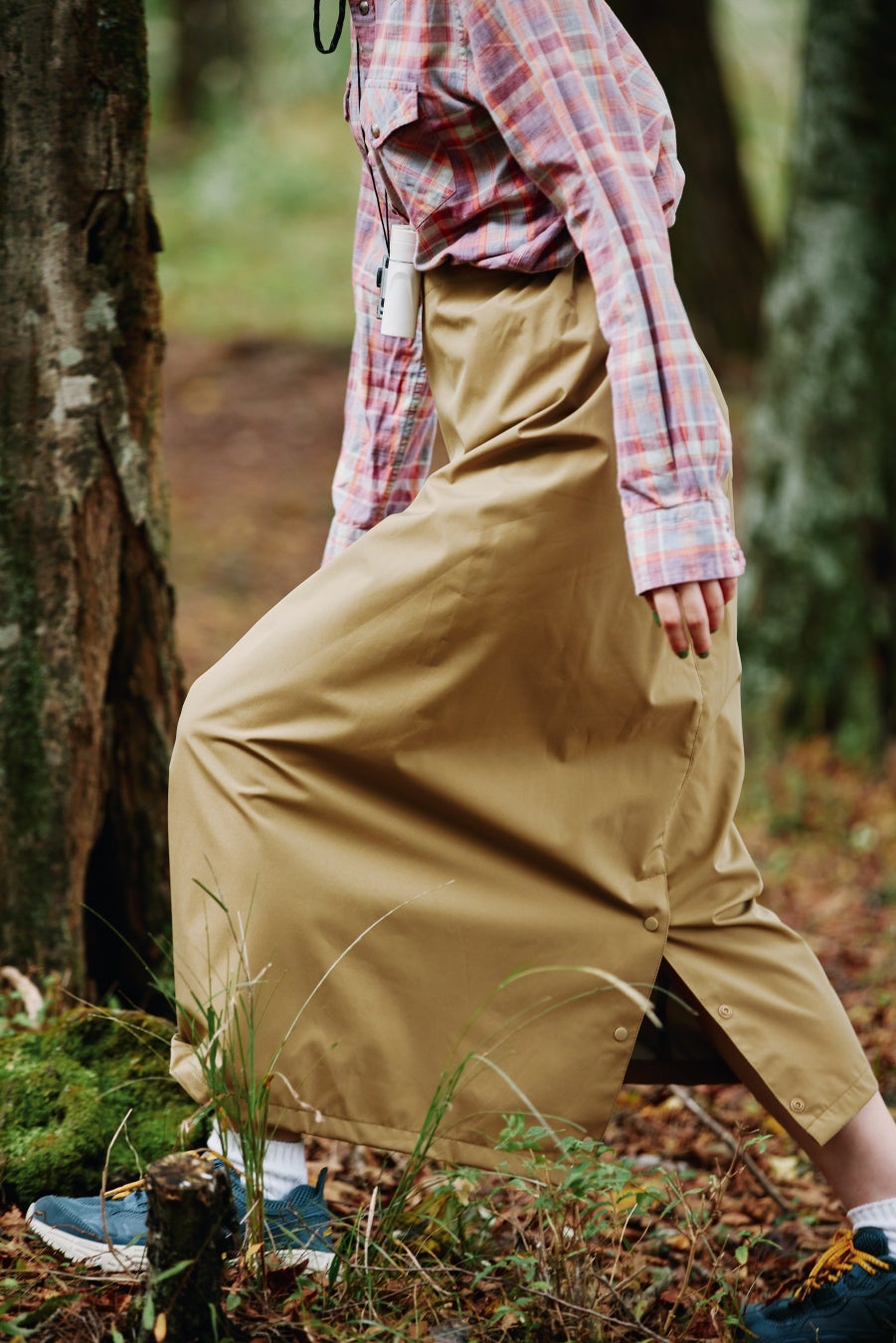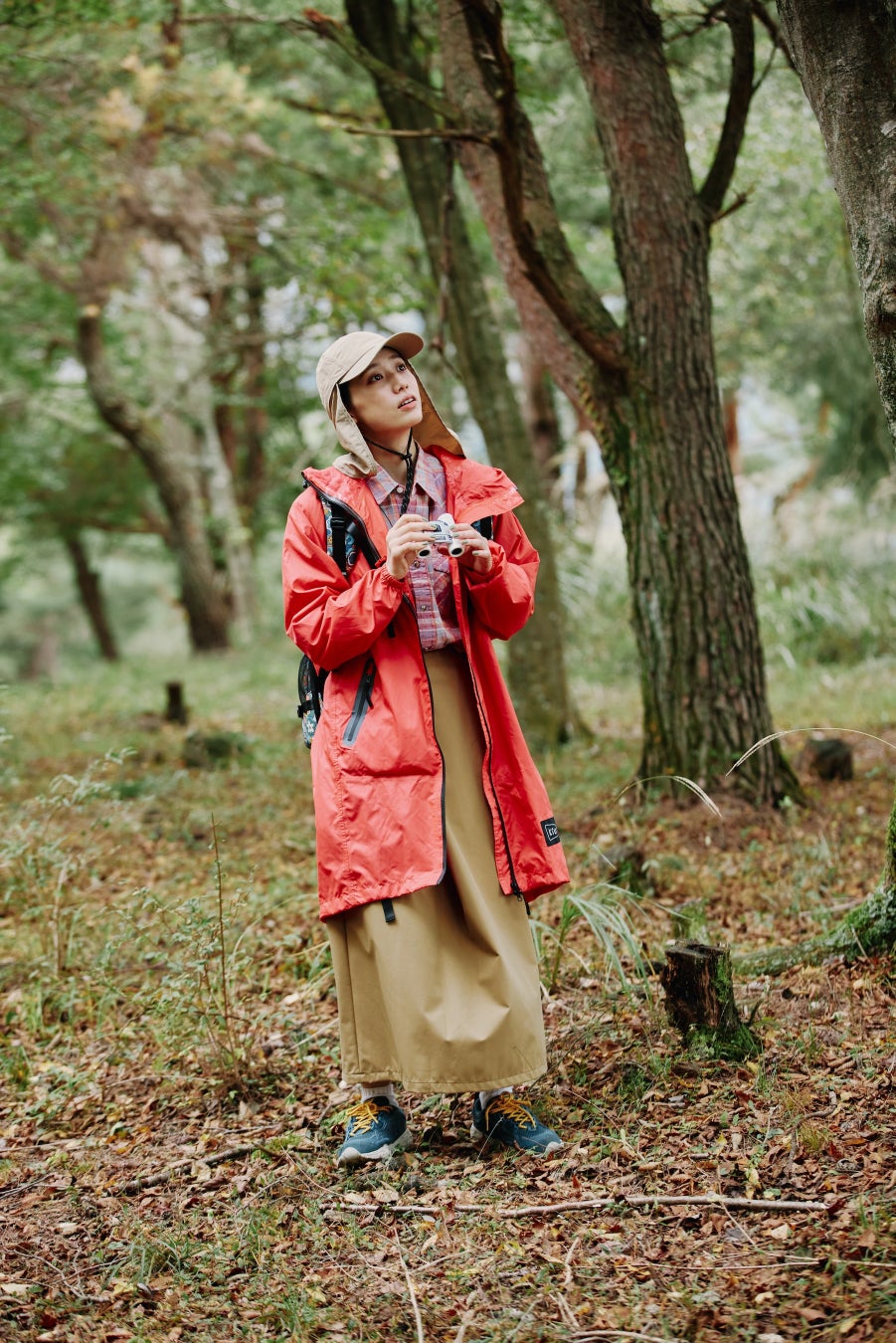四季を感じる山の中で、しとしと降る雨が神秘的な風景を演出。 ノンストレスの軽量アウターと耐水性に優れたボトムスで、全身しっかり雨対策。濡れを気にせず五感を研ぎ澄ませることで、自然と一体化するような感覚に浸れます。