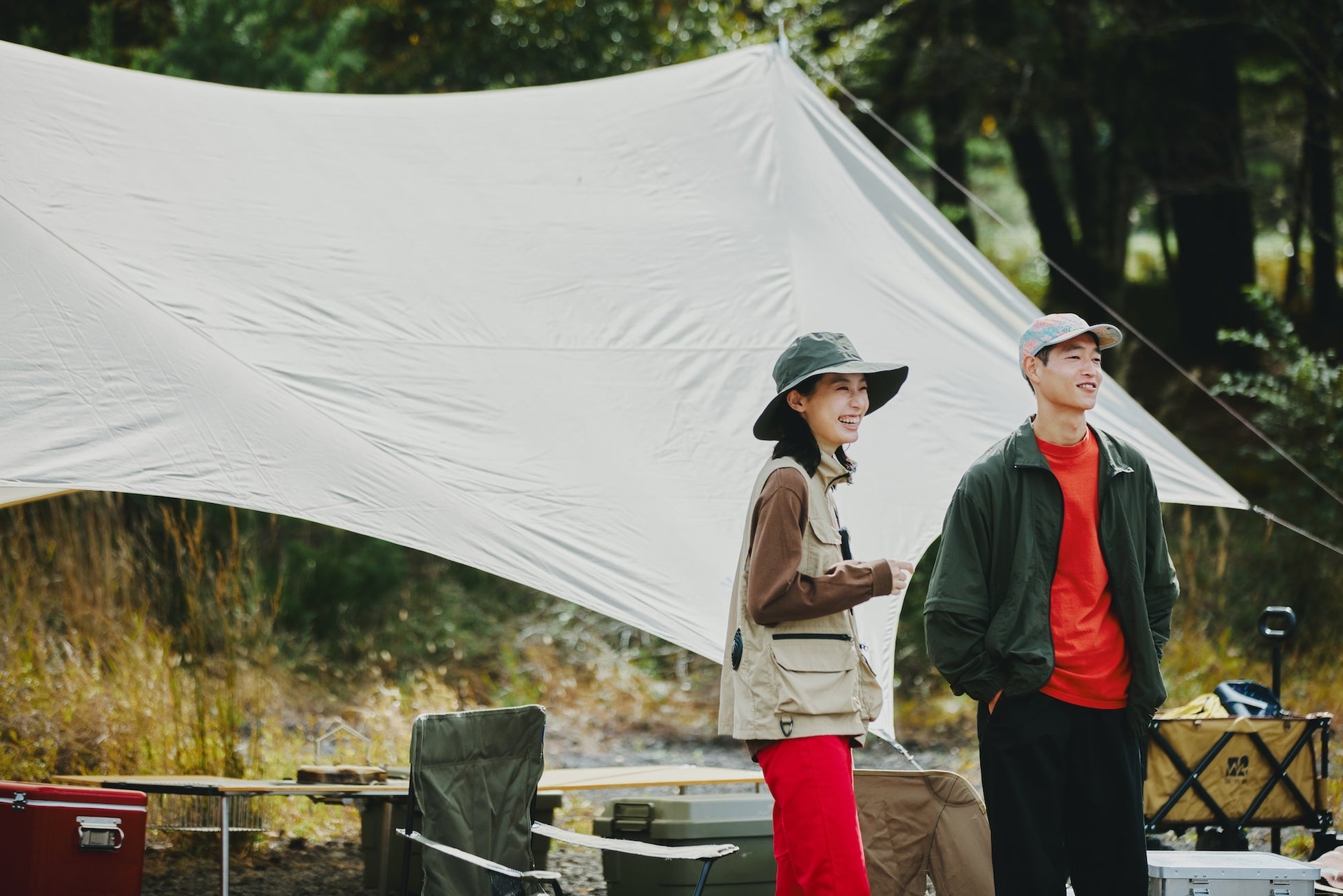仲間と力を合わせてキャンプを設営。気温が上がれば空調服で快適に、雨が降ればレインポンチョでしっかり対策。 キャンプは装備の機能性が生きるシーン。KiUのアイテムは、過酷な自然環境でも快適さを保ち、のんびりと自然を満喫する時間をサポートします。
