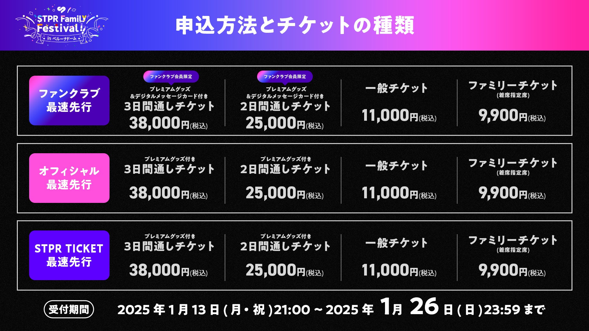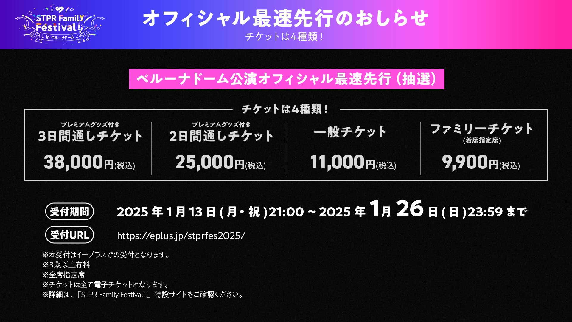 オフィシャルチケット最速先行受付は、2025年1月13日(月・祝) 21:00より公式ファンクラブ、STPR TICKET、イープラスにてお申込みを受け付けております。