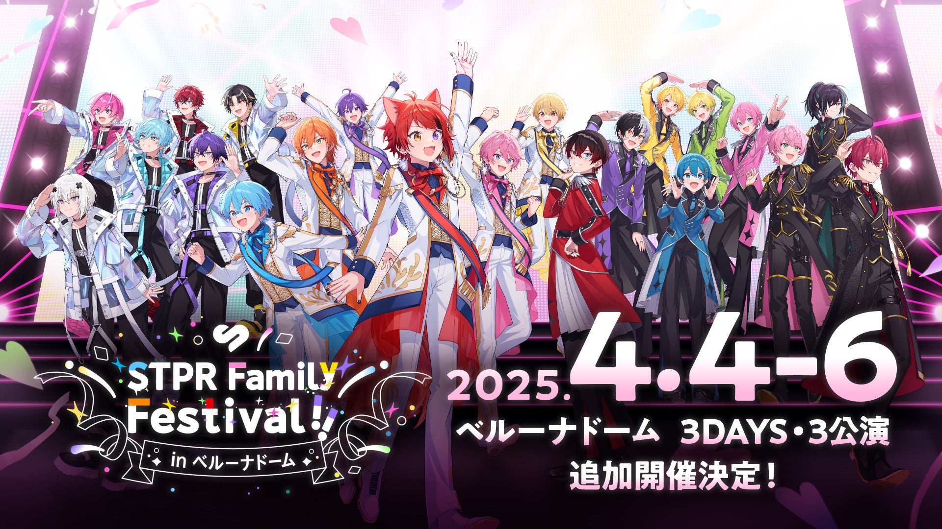 株式会社STPR (本社:東京都渋谷区 代表:柏原 真人、以下STPR)は、「すとぷり」「Knight A - 騎士A -」「AMPTAKxCOLORS」「めておら - Meteorites -」など、所属のクリエイターが集結した大型ライブフェス『STPR Family Festival!!』の追加公演『STPR Family Festival!! in ベルーナドーム』のオフィシャルチケット最速先行受付を開始したことをお知らせいたします。