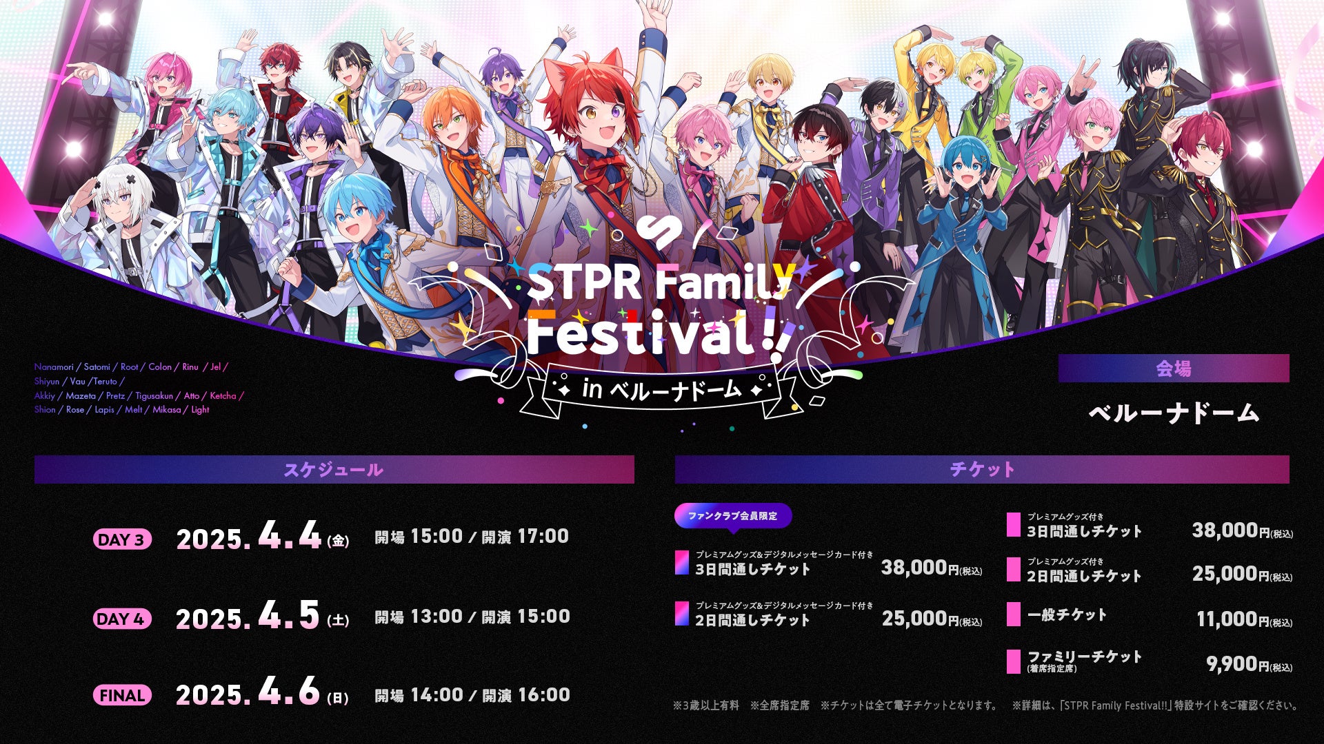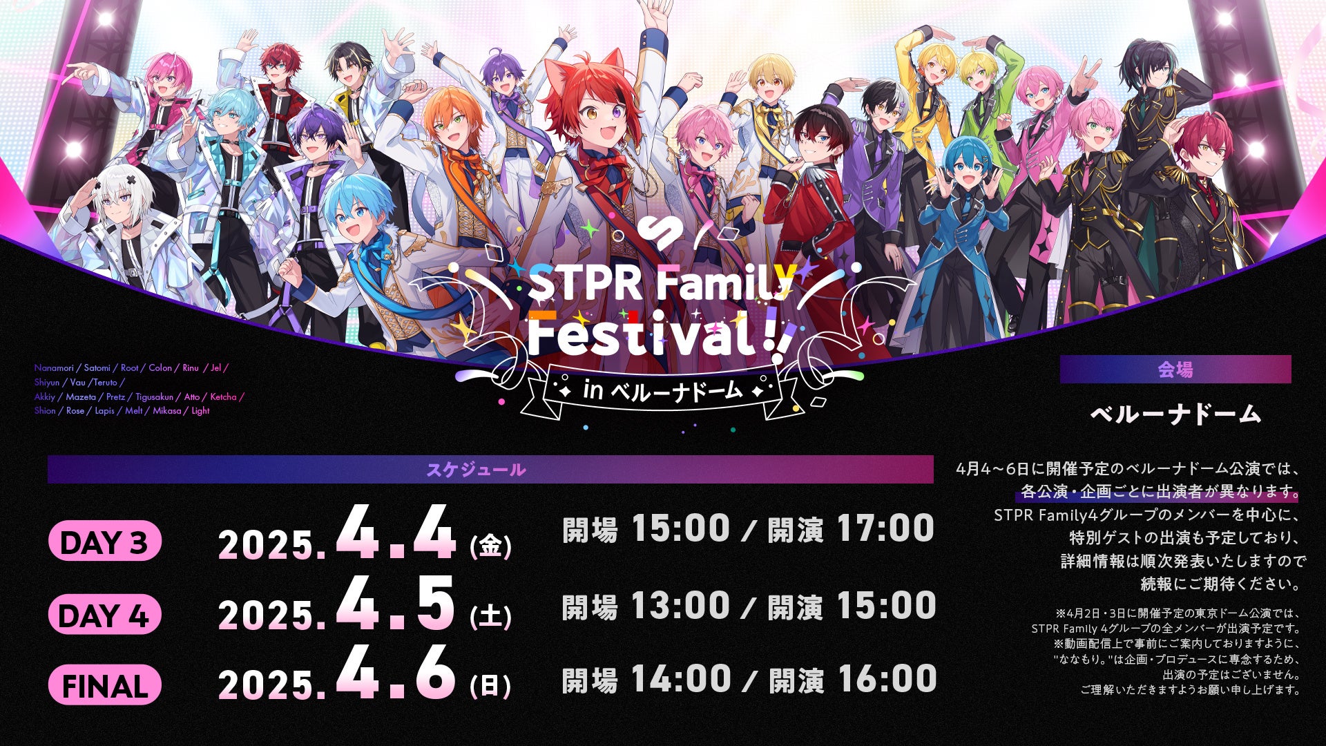 2025年4月4日(金)~4月6日(日)開催のベルーナドーム公演では、各公演・企画ごとに出演者が異なります。「STPR Family」4グループのメンバーを中心に、特別ゲストの出演も予定しており、詳細情報は順次発表いたしますので続報にご期待ください。