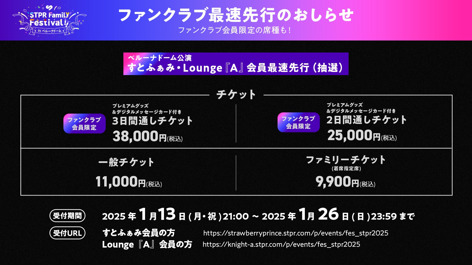 ※本受付はファンクラブ先行です。 チケットのお申込みは、すとぷり公式ファンクラブ「すとふぁみ」、Knight A - 騎士A -公式ファンクラブ「Knight A Family Club Lounge『A』」への会員登録および、STPR IDへの会員登録が必要です。