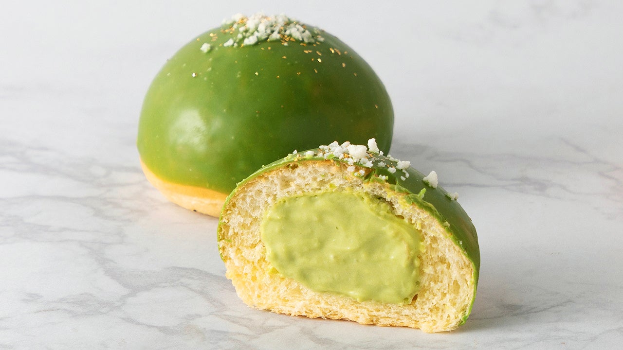 しっとりふんわり柔らかな生地の中に、抹茶クリームを入れました。鮮やかなグリーンのコーティングに金粉をふりかけた上品な見た目と、上質な抹茶の風味が感じられる、エメラルドのような見た目も華やかなミニくりーむパンです。