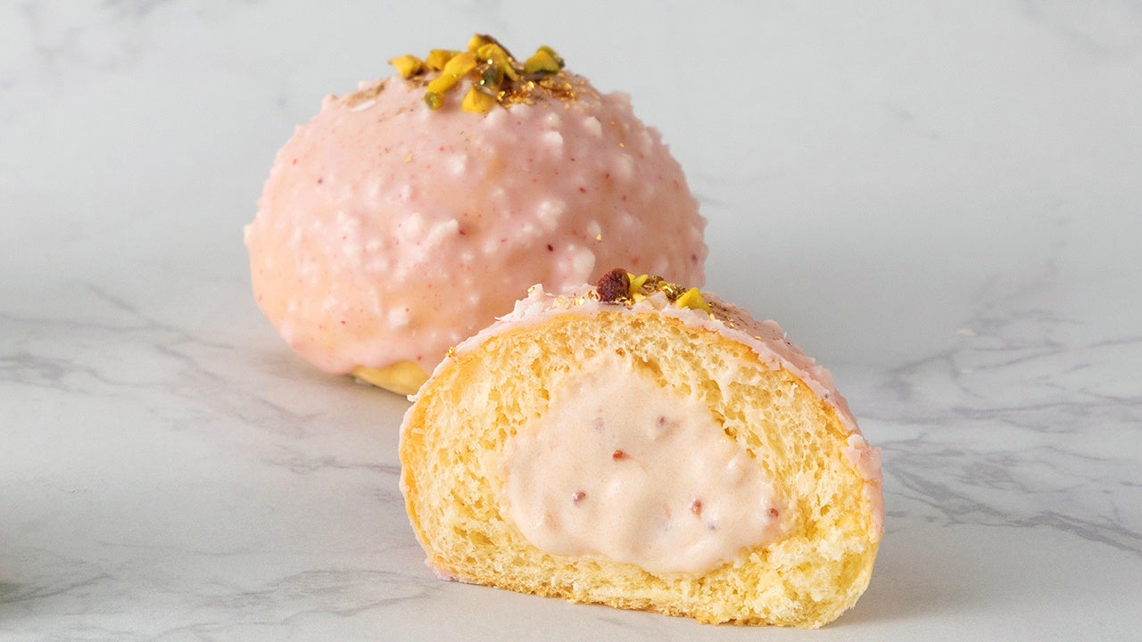 しっとりふんわり柔らかな生地の中に、キルシュを加えたストロベリークリームを入れました。アクセントにカルダモンとピスタチオをトッピングし、食感もお楽しみいただけます。クリームのなめらかで優しい味わいに大人な酸味がプラスされた、ピンク色が可愛らしいミニくりーむパンです。(※1)