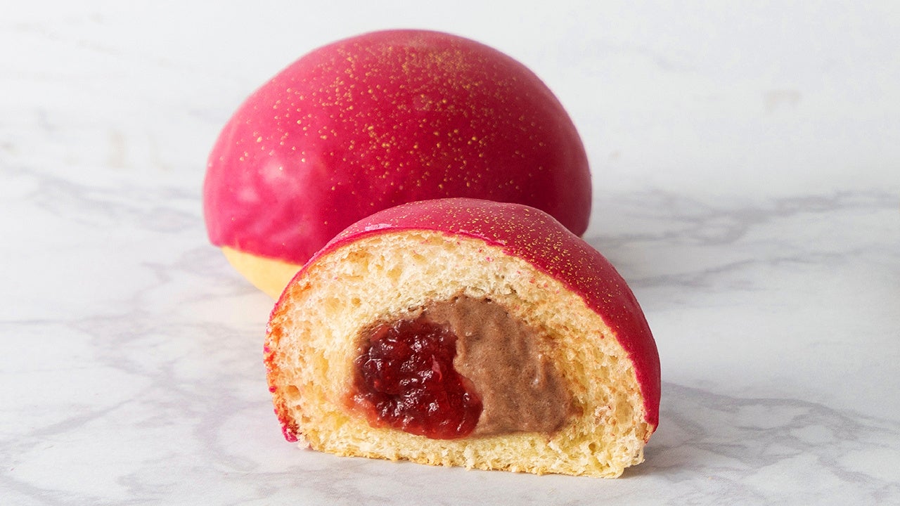しっとりふんわり柔らかな生地の中に、ココアクリームとフランボワーズフィリングを2層仕立てで入れ、表面には金粉をふりかけました。フランボワーズのルビーのような透き通る赤色と、上品な香り、甘酸っぱさをお楽しみいただけるミニくりーむパンです。