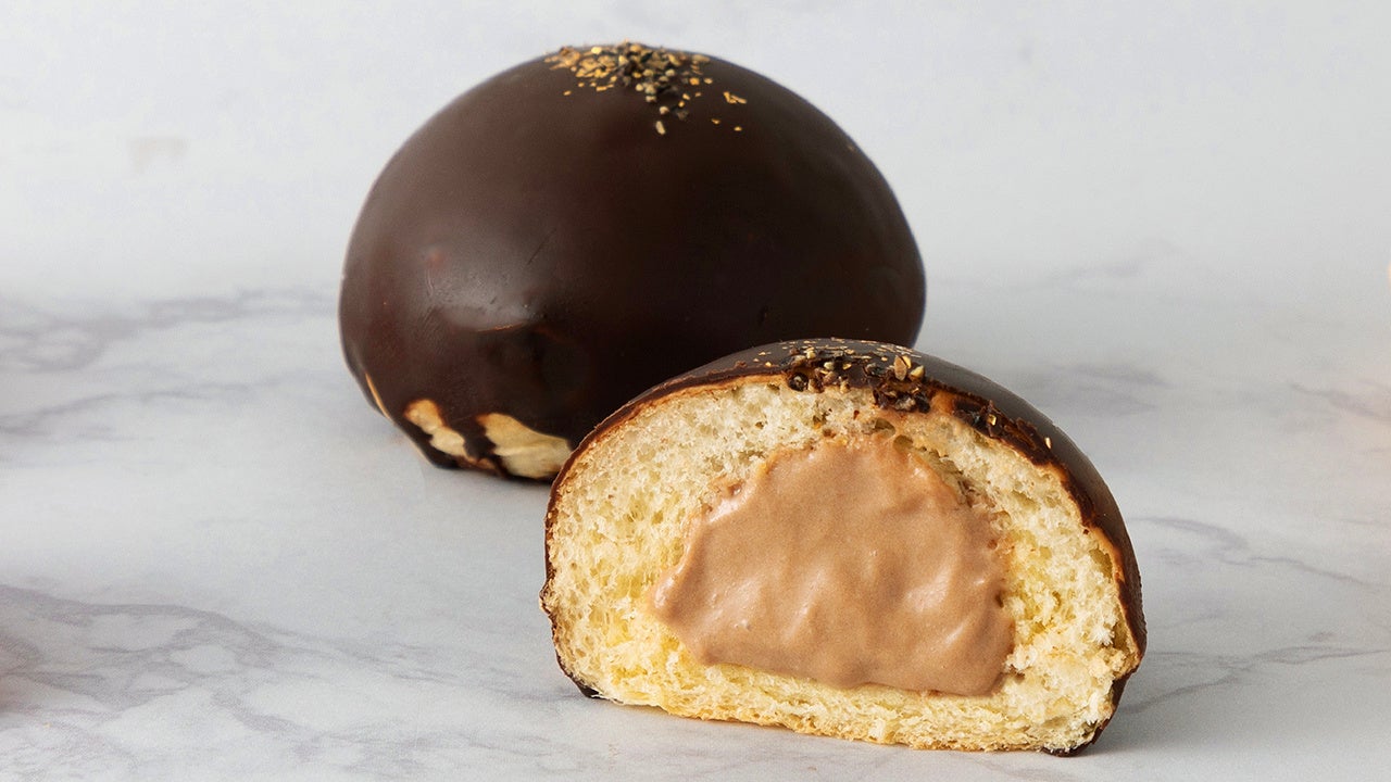 しっとりふんわり柔らかな生地の中に、ラム酒を加えたなめらかなチョコレートクリームを入れました。表面には金粉とチョコレートをコーティングすることで、上品な光沢のある仕上がりと少し大人なチョコレートの風味をお楽しみいただけるミニくりーむパンです。(※1)