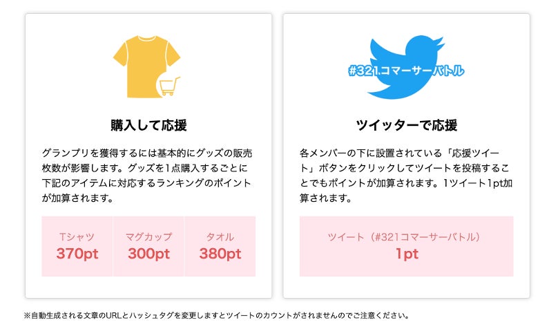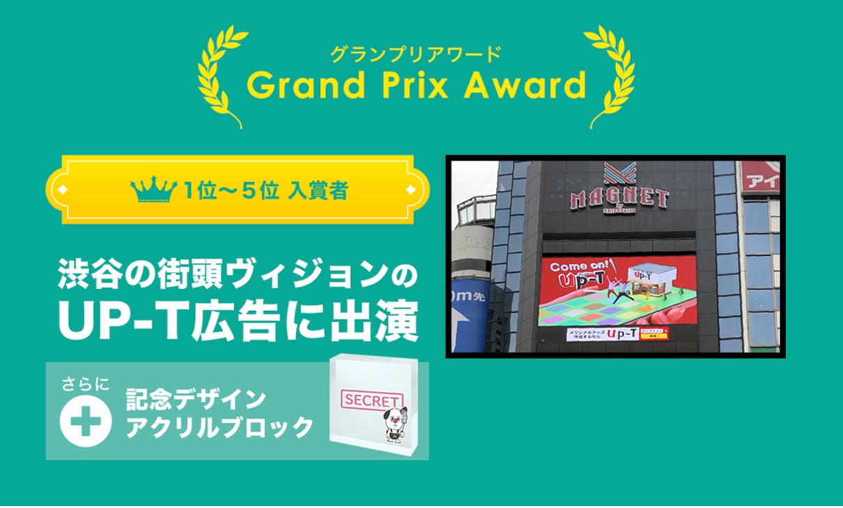 オリジナルグッズ作成のUP-Tと321所属の人気コマーサーのコラボレーション企画がスタート!渋谷109フォーラムヴィジョン出演権をかけて争奪バトルを開催します。本イベント限定で描き下ろしたグッズを販売して最も多くのポイントを獲得した出演者がグランプリに輝きます!イベントへの参加方法は、応援購入だけでなく、ツイッターでの投稿からも手軽に応援することができます。ぜひ皆さんの応援で、推しの321コマーサーが渋谷のヴィジョンに出演する夢を叶えましょう!