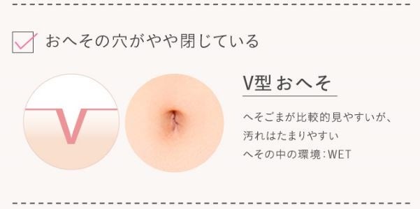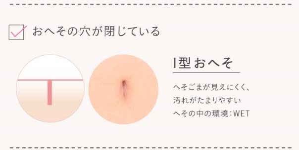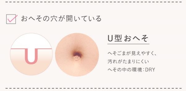 おへその形は主に、V型、I型、U型の3種に分類されます。特に、V型、I型の人はへそごまの汚れやニオイがたまりやすいので、定期的なお手入れをおすすめしています。