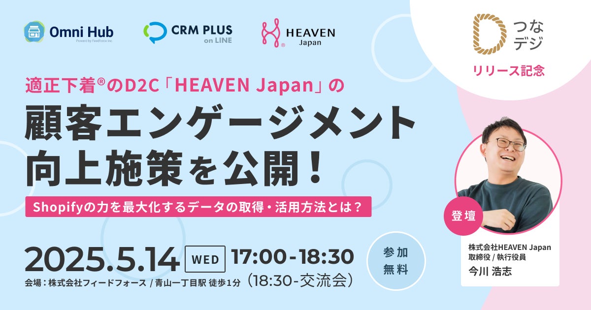 フィードフォースグループ株式会社(所在地:東京都港区、代表取締役:塚田 耕司、以下「フィードフォースグループ」)は、株式会社HEAVEN Japan(所在地:大阪府河内長野市、代表取締役:松田 崇、以下「HEAVEN Japan」)と提携し、フィードフォースグループが提供する各アプリと、HEAVEN Japanが実際の小売事業運営において行った施策群を連携し、Shopify利用マーチャントの顧客エンゲージメント向上によるDX支援パッケージ「つなデジ」を提供開始したことをご案内いたします。