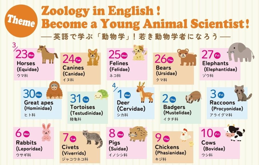 今年のテーマは「英語で学ぶ動物学! 若き動物学者になろう」。馬やゾウ、アライグマなど、子どもたちに人気の動物を日替わりでテーマに、英語を使いながら楽しく探究します。
