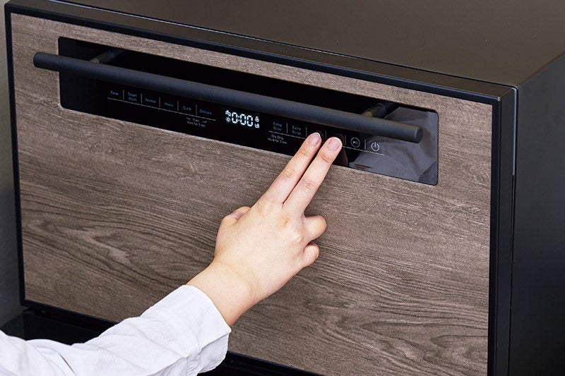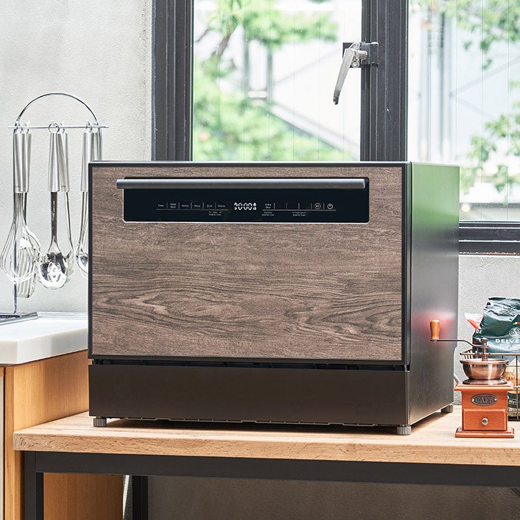 ファミリーサイズながら工事不要。木目柄のスタイリッシュな食洗機