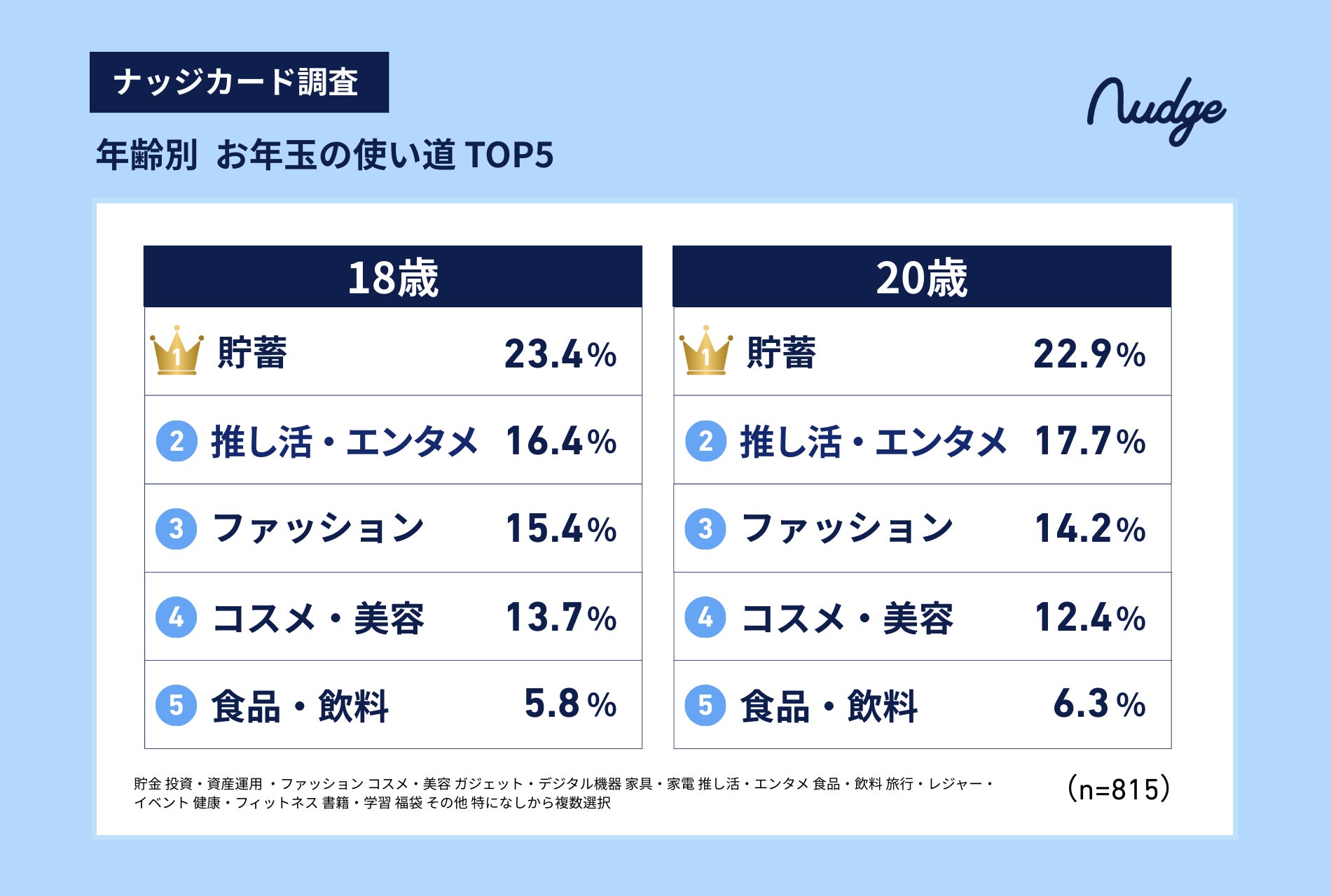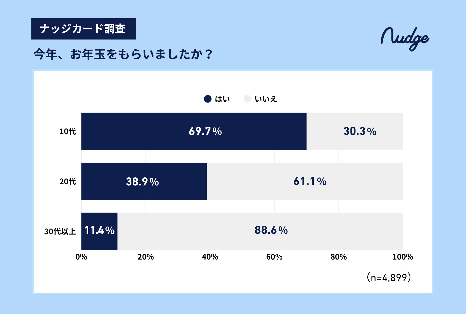 ナッジ株式会社(本社:東京都千代田区、代表取締役:沖田 貴史)は、次世代クレジットカード「Nudge(ナッジ、以下「ナッジカード」)ユーザーを対象に「お年玉に関する実態調査」を実施いたしました。