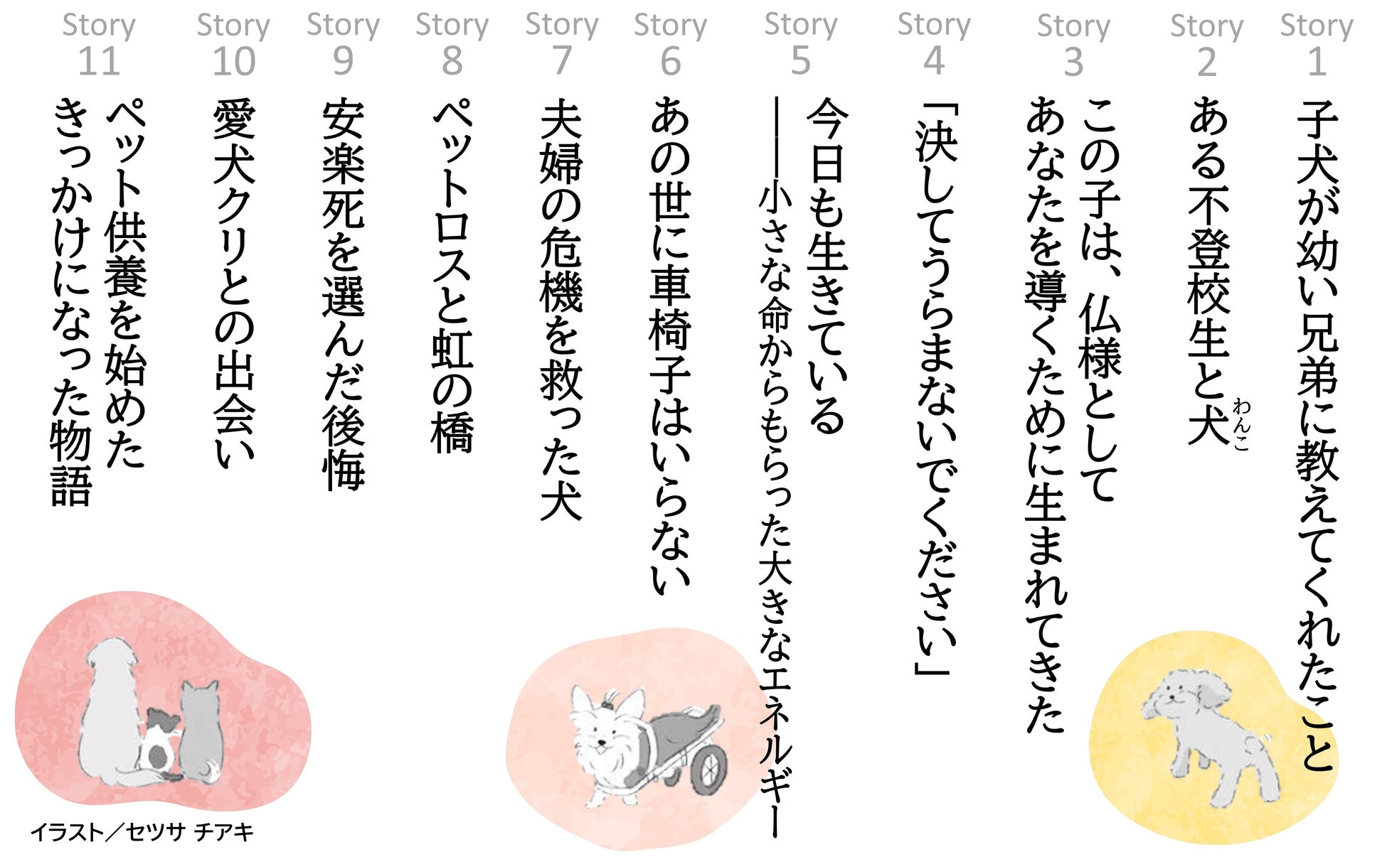 本書は、住職が多くのワンちゃんとの別れに立ち会ってきたなかで、とくに印象に残り、今でも忘れられない11のストーリーを紹介します。