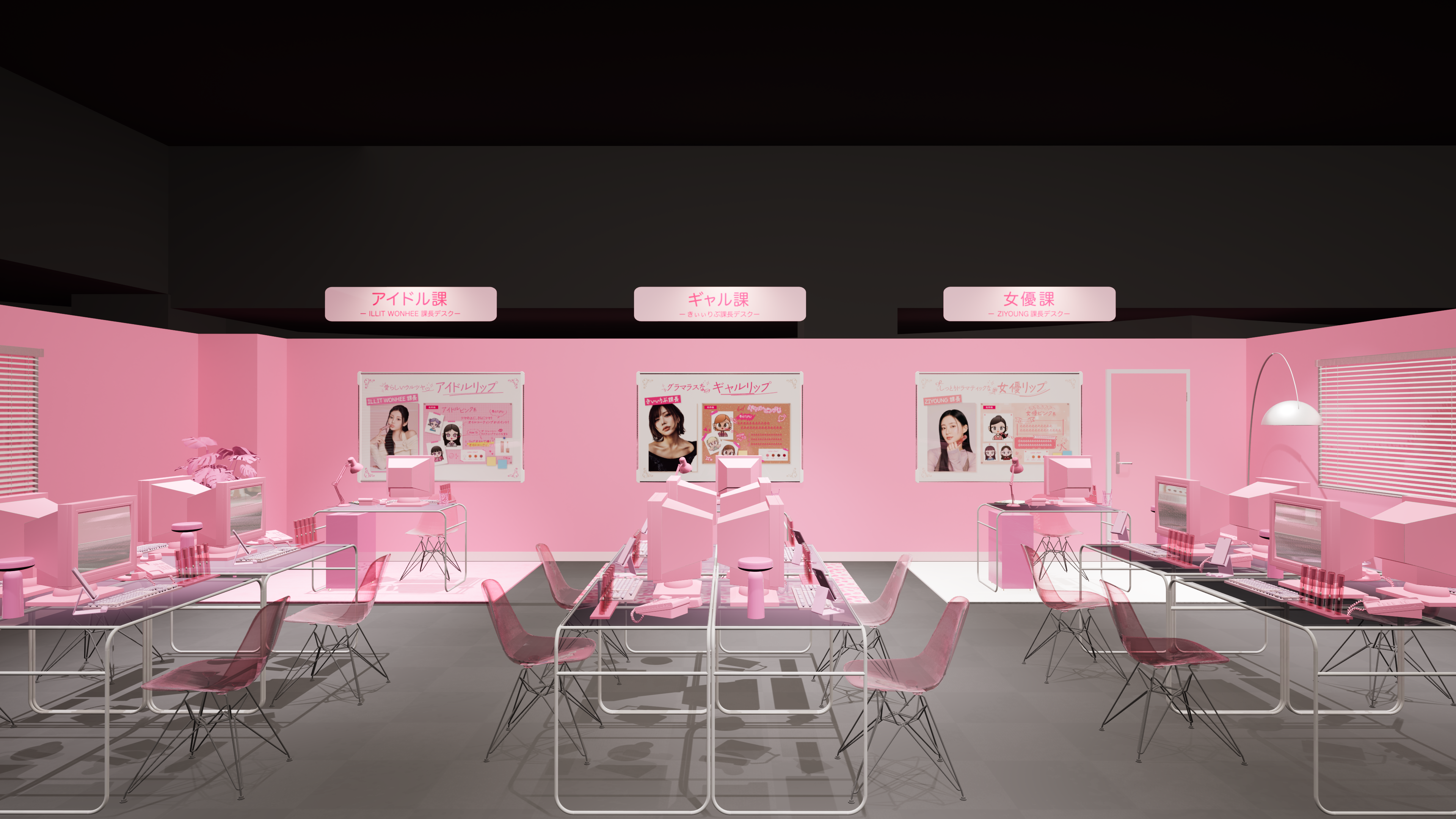 “ロムアンド商事”のオフィスをモチーフとした“00年代風”のピンクのキュートな空間の中で、リップ