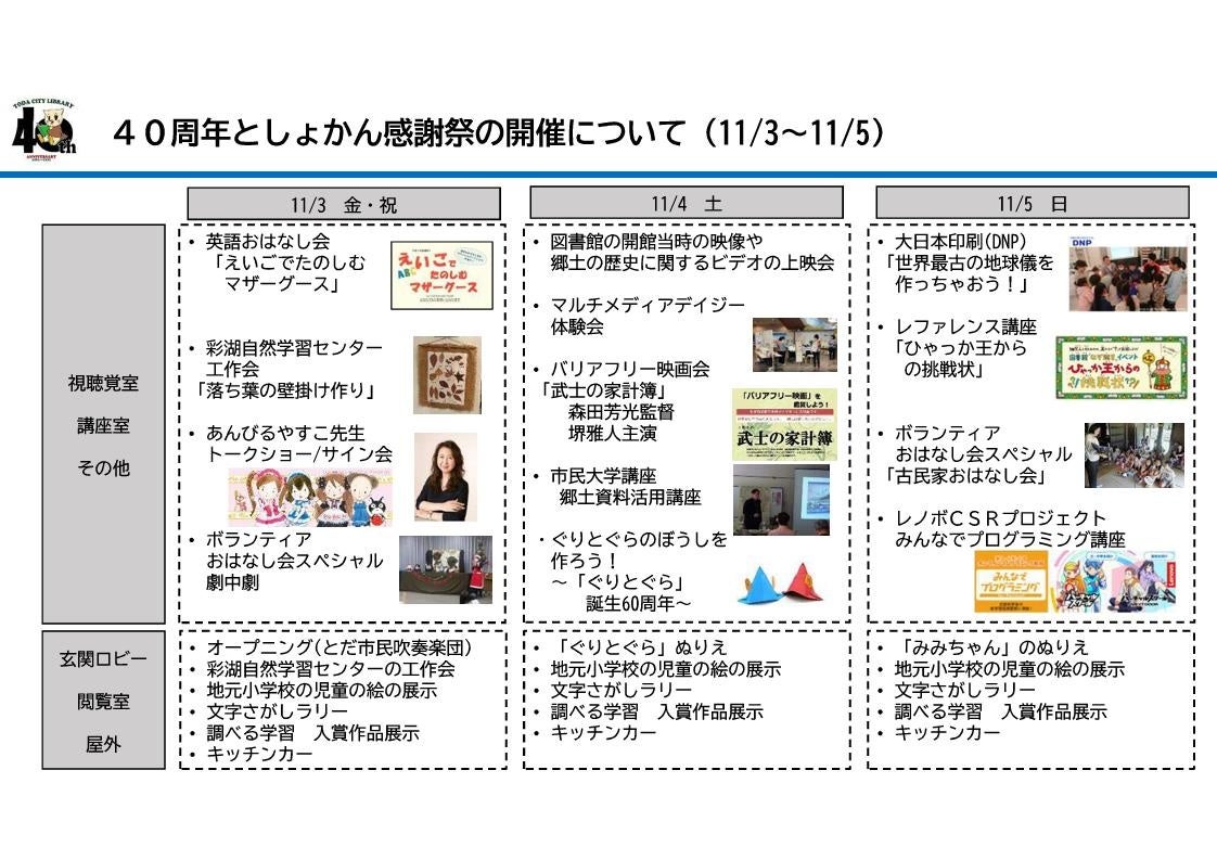 戸田市立中央図書館では、昭和58年11月の図書館開館から今年で40年を迎えることを記念し、皆様への感謝の気持ちを込めて、11月3日、4日、5日の3日間、記念イベントを開催します。