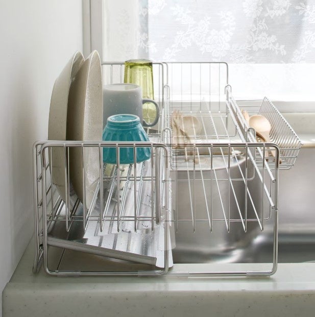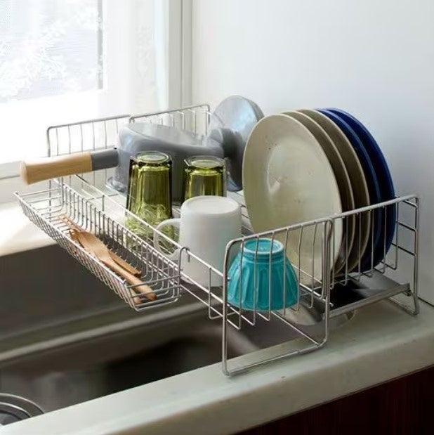 ぐぅーんとカゴが伸びて、お皿がビシッと自立する「お皿が自立して幅が広がる水切り/小物ポケット付」がセシールから新発売。