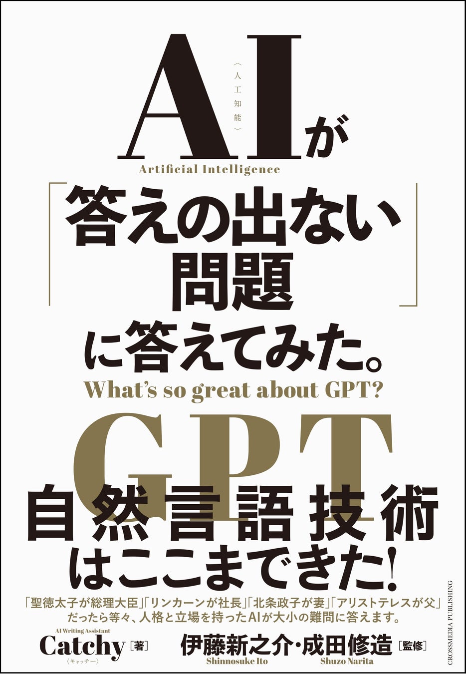 株式会社クロスメディア・パブリッシング(東京・渋谷区、代表取締役・小早川幸一郎)は、2023年3月24日にAIによるビジネス書『AIが「答えの出ない問題」に答えてみた。』を発売します。ChatGPTなどで話題になっている「AI」。本書では、それを使って歴史上の人物の人格を生成し、「現代人が抱えている悩み・問題」に対してどのような回答をするのかを検証してみました! 「貯蓄と投資はどちらを優先するべきか」「給料のいい仕事か情熱のある仕事、どちらに重点を置くべきか」など、100個の「答えが出ない問題」。それに対して、徳川家康、孔子、エジソンなど、国内外20人の「偉人AI」が新しい考え方や解決策を提示します。歴史上の人物は、またAIは、「現代の人間が抱える悩み」についてどう考えるのでしょうか?