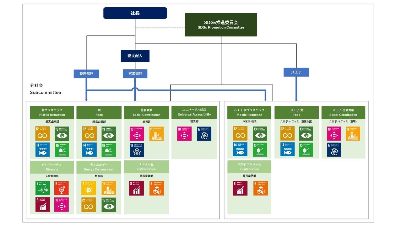 京王プラザホテルでは、2024年6月に当社のSDGsの取り組みをより一層発展させるため「SDGs推進」という部署を新設しました。「SDGs推進」を事務局に全社横断で組織した「SDGs推進委員会」を結成し、具体的な課題には分科会を設置して取り組んでいます。2025年3月にはロゴとコミットメント(後述)を策定し、従業員の意識の統一を目指しています。実際に、バーテンダーがSDGsカクテルを紹介する際にホームページやメニューにロゴ使用を希望するなどの動きも出ています。