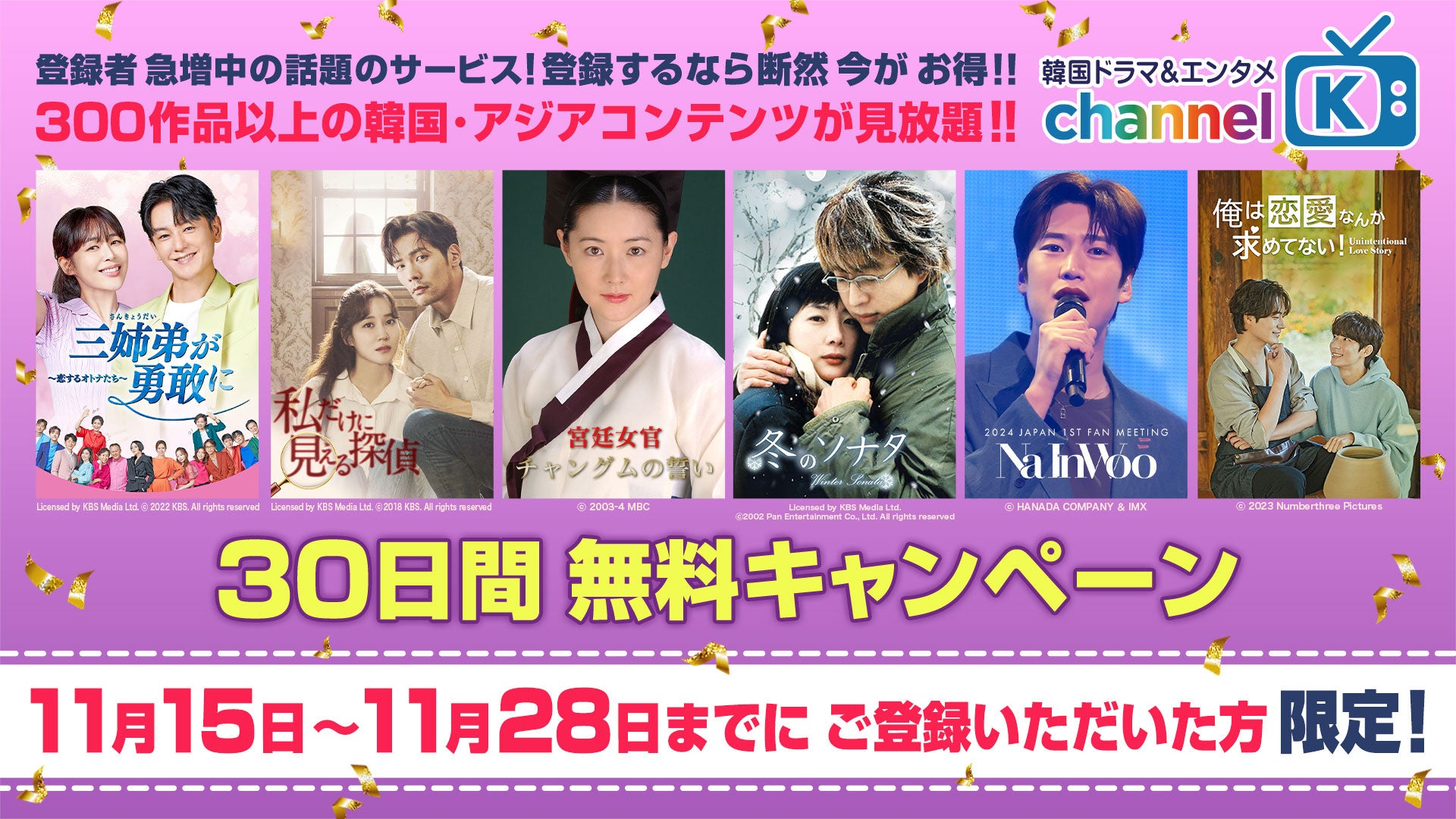 しかし今年も残すところわずかとなった今、年末へ向けて韓国ドラマ好きの皆さまに思う存分作品を楽しんでいただくため、11月15日(金)~11月28日(木)の期間限定で「チャンネルK」に新規ご登録をいただいた方を対象に、現在配信中の全コンテンツを30日間無料でお試しいただける特別なキャンペーンをスタートいたしました。