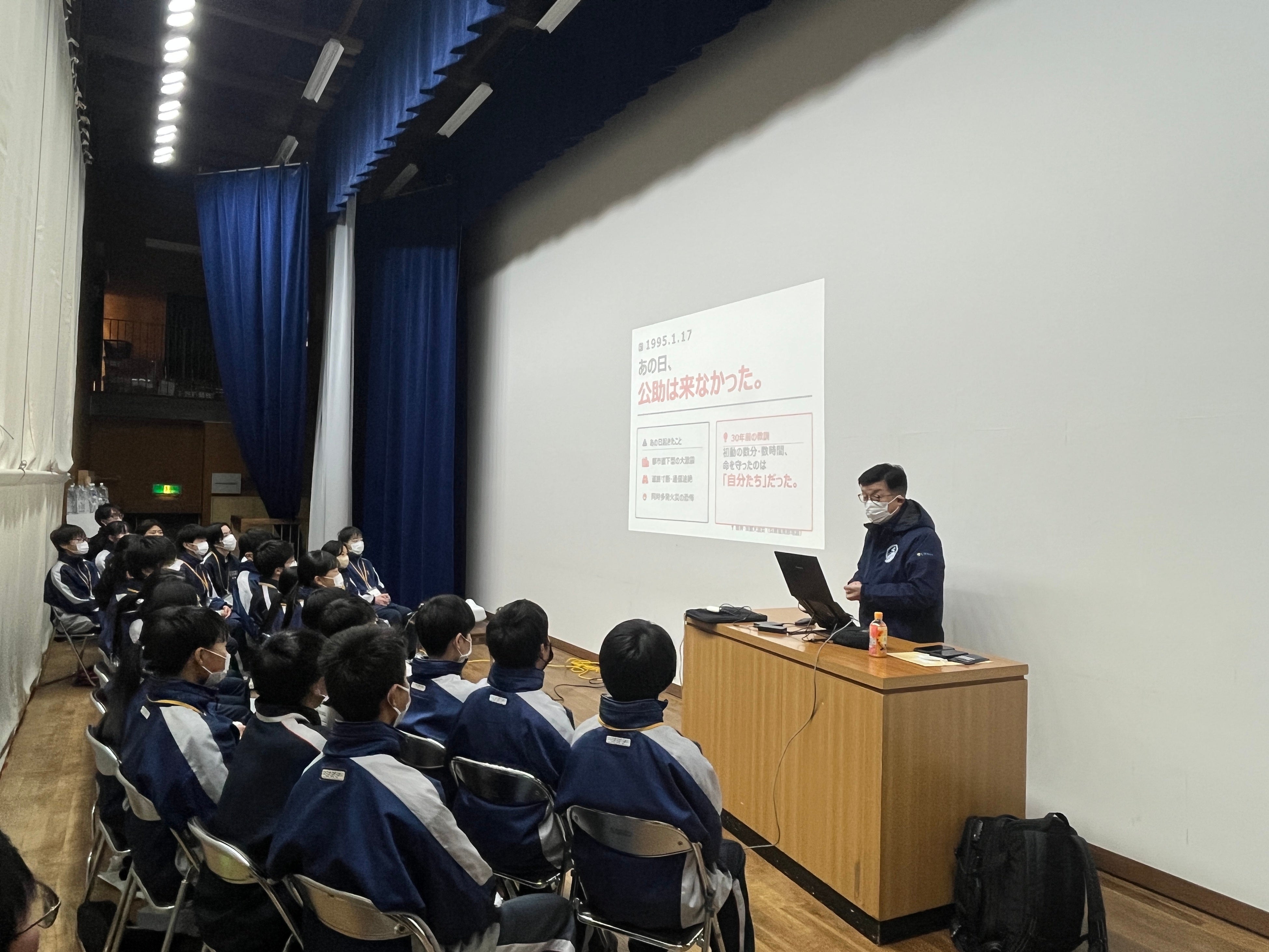 当社やそのほかの自治体や大学で防災に尽力している、田中健一による講話では、「中学生の防災」をテーマに、自らの命を守り、地域で貢献するために必要な具体的な行動について解説しました。