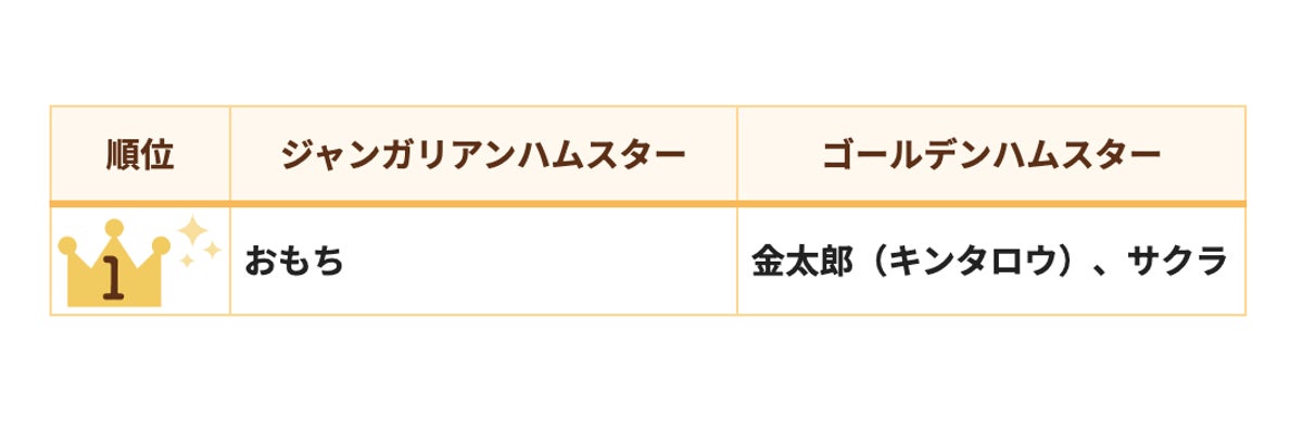品種別で見てみると、ジャンガリアンハムスターでは「おもち」が堂々の1位、ゴールデンハムスターでは「金太郎(キンタロウ)」「サクラ」が同率1位との結果になりました。