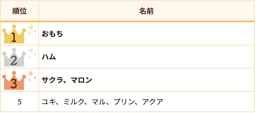 5位には同率で「ユキ」「ミルク」「マル」など、見た目から連想される名前が上位となりました。