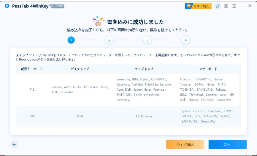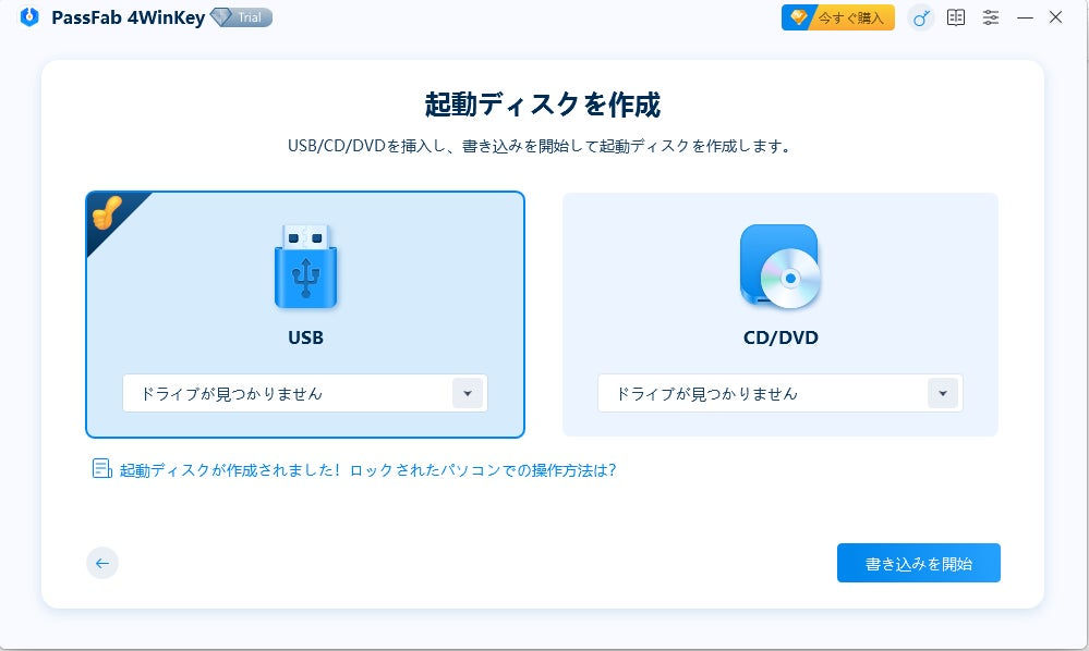 Step1:PassFab 4WinKeyを使用可能なパソコンにダウンロードして起動します。USBまたはCD/DVDをパソコンに挿入し、「書き込みを開始」をクリックします。