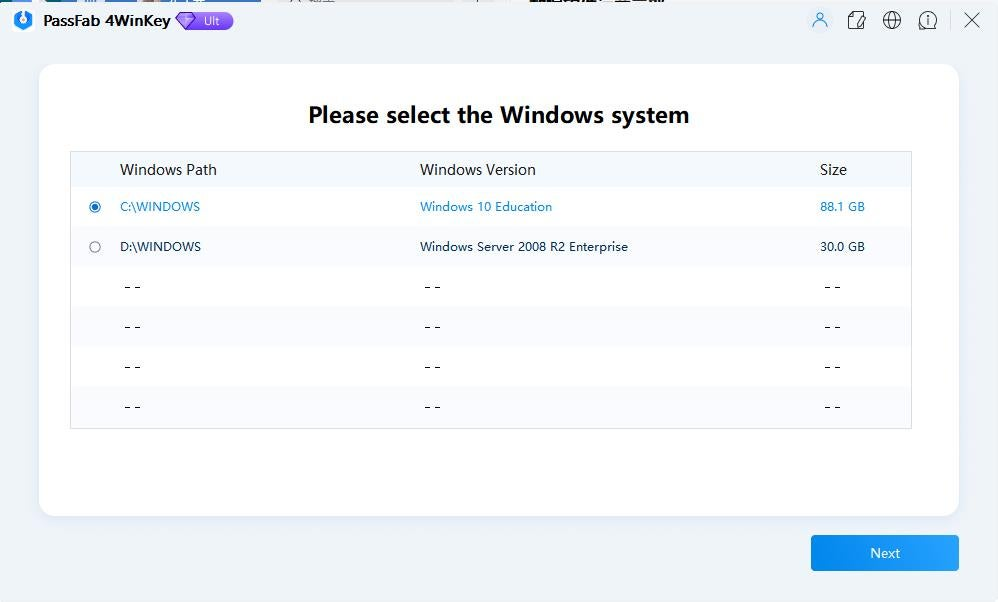 Step3:PassFab 4WinKeyのメニュー画面が表示されたら、Windowsシステムを選択して「次へ」をクリックします。