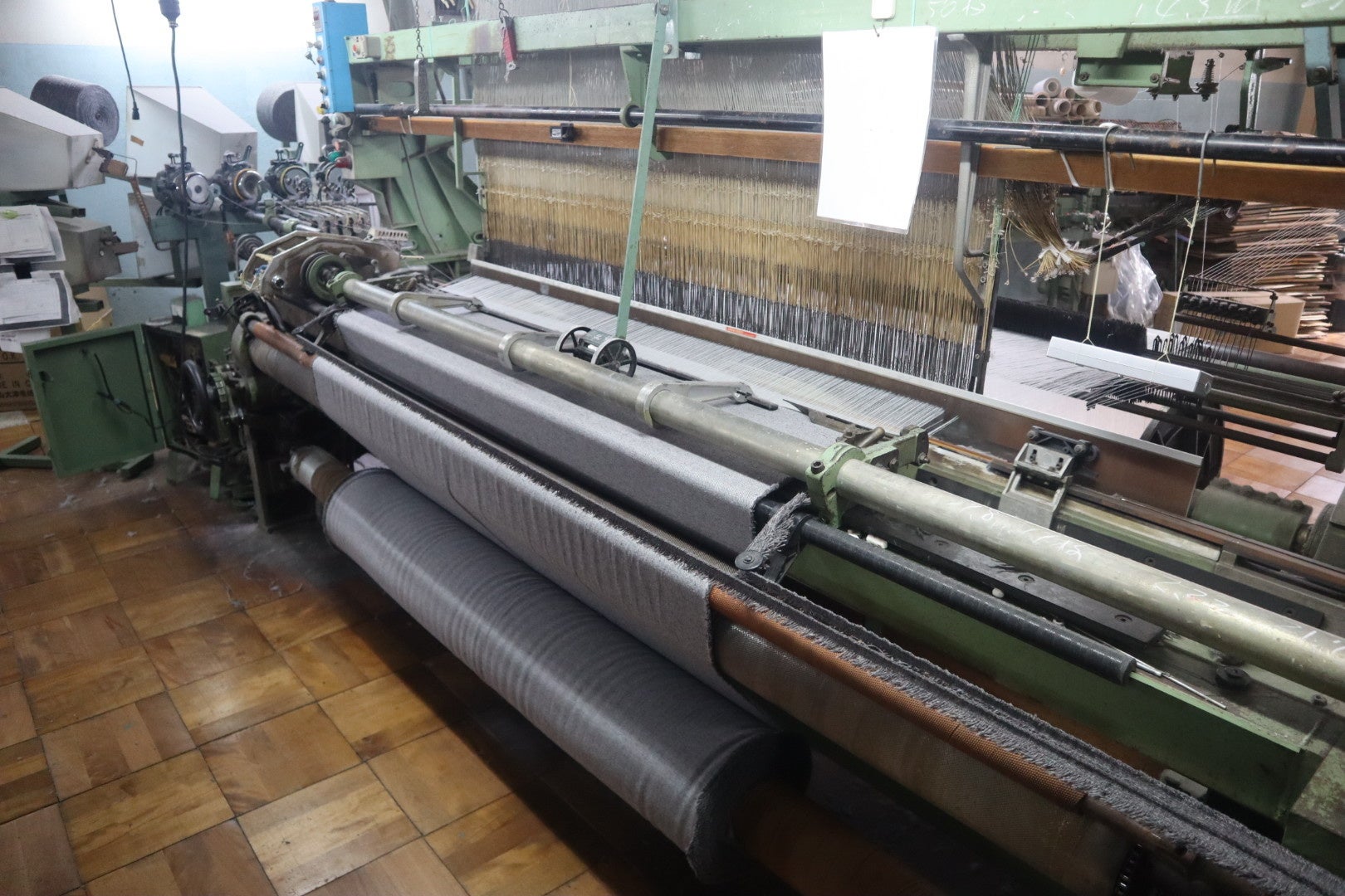 ・専用機械で撚りをかけて糸に仕上げます。この糸を紡織機で織り上げて反物にし、高温洗浄にて汚れを溶解し殺菌します。