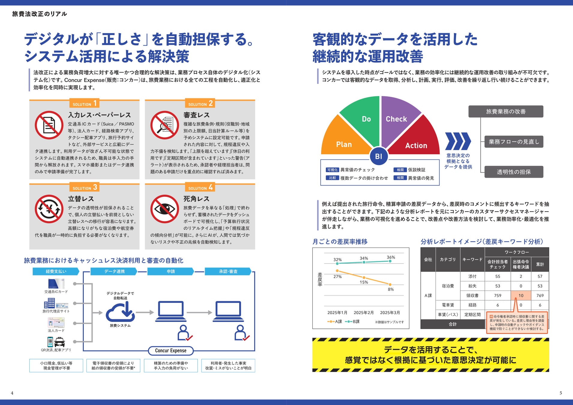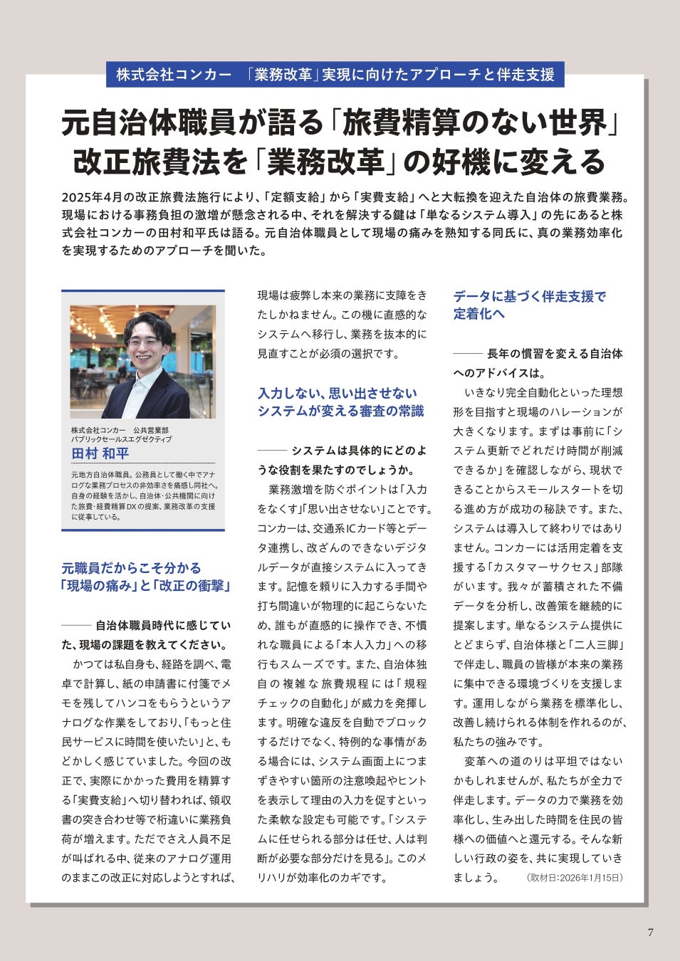 本ガイドでは、「経費精算DXで業務を効率化」をテーマに、デジタル技術の活用を前提とした旅費業務の抜本的な見直し方について徹底解説しています。さらに本誌内では、元・自治体職員として現場の課題を熟知する、株式会社コンカーの田村和平氏への特別インタビュー「元自治体職員が語る『旅費精算のない世界』」を掲載。経費精算システムによる「入力レス」や「審査レス」の実現など、改正旅費法を単なる法対応にとどめず「業務改革」の好機に変えるための実践的なアプローチをご紹介しています。